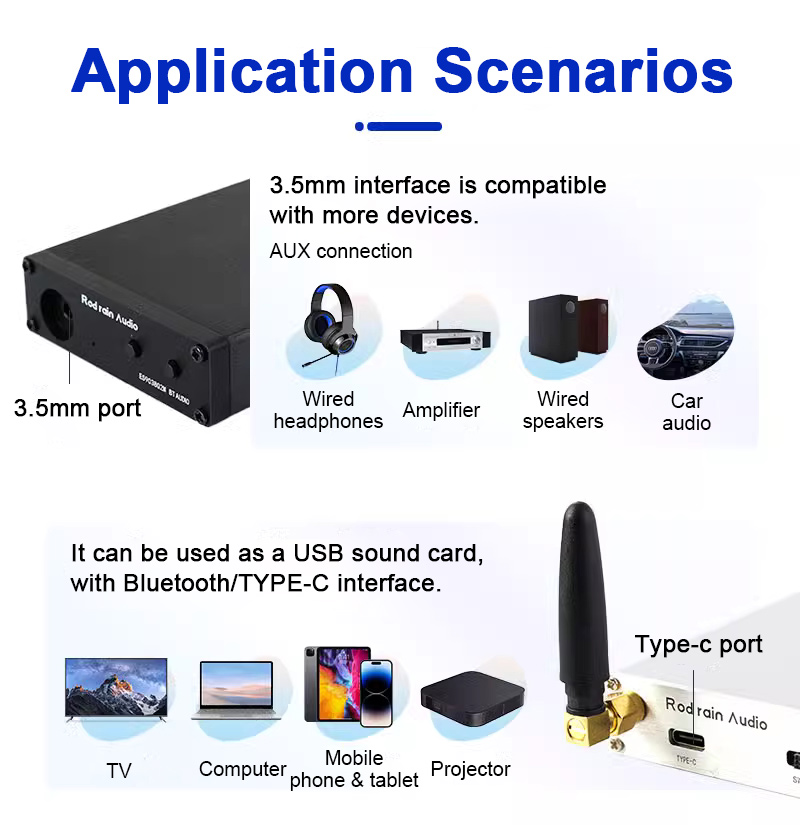 - HD Bluetooth technology: The Bluetooth audio receiver adopts QCC5125 module. It supports for SBC/AAC/aptX/aptX LL/aptX HD/LDAC Bluetooth audio protocols. Through Bluetooth, it can be connected to your phone, computer and tablet. It is more convenient to play music and enjoy CD-level sound quality