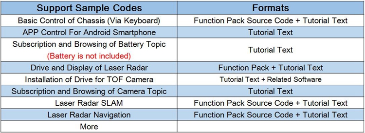 - Easy Connection: Just an USB cable is needed to connect the chassis with the host for Linux. Base_control function pack is provided to run to build up the connection between ROS system and the chassis. The topics subscribed and published by this feature pack are standard topics under ROS, featuring excellent compatibility.