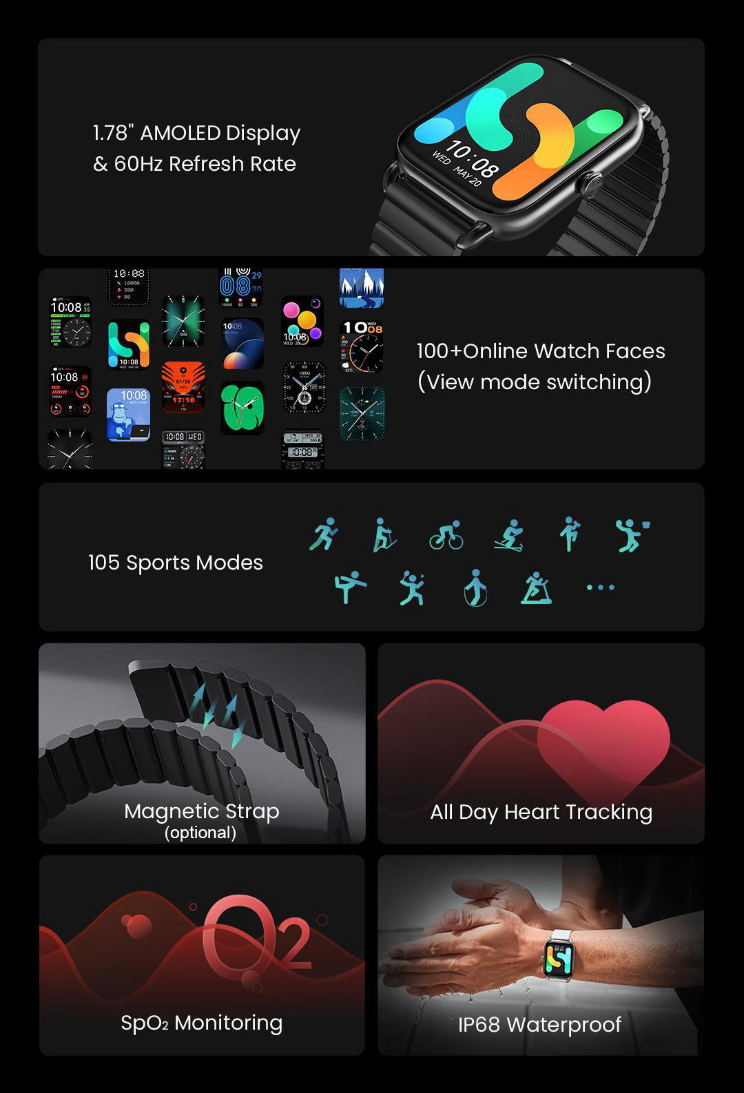 - 1.78" AMOLED display & 60Hz refresh rate, 100+ online watch faces (view mode switching), and 105 sports modes.