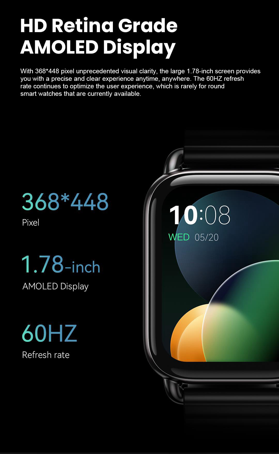- With an HD retina grade AMOLED display and 368*448 pixel unprecedented visual clarity, the large 1.78-inch screen provides you with a precise and clear experience anytime, anywhere.