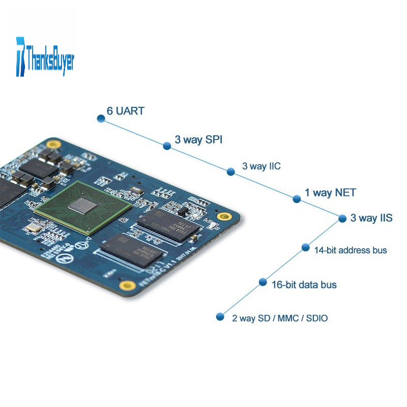 -Rich bus interface, expansion is more flexible. The number of pins on the core board is 320PIN, which leads all the CPU functions, supports 6 UART, 3 IIC, 3 SPI, 2 SD / MMC / SDIO, 3 IIS, 1 Gigabit Ethernet port, 16-bit data bus 14 Bit address bus.