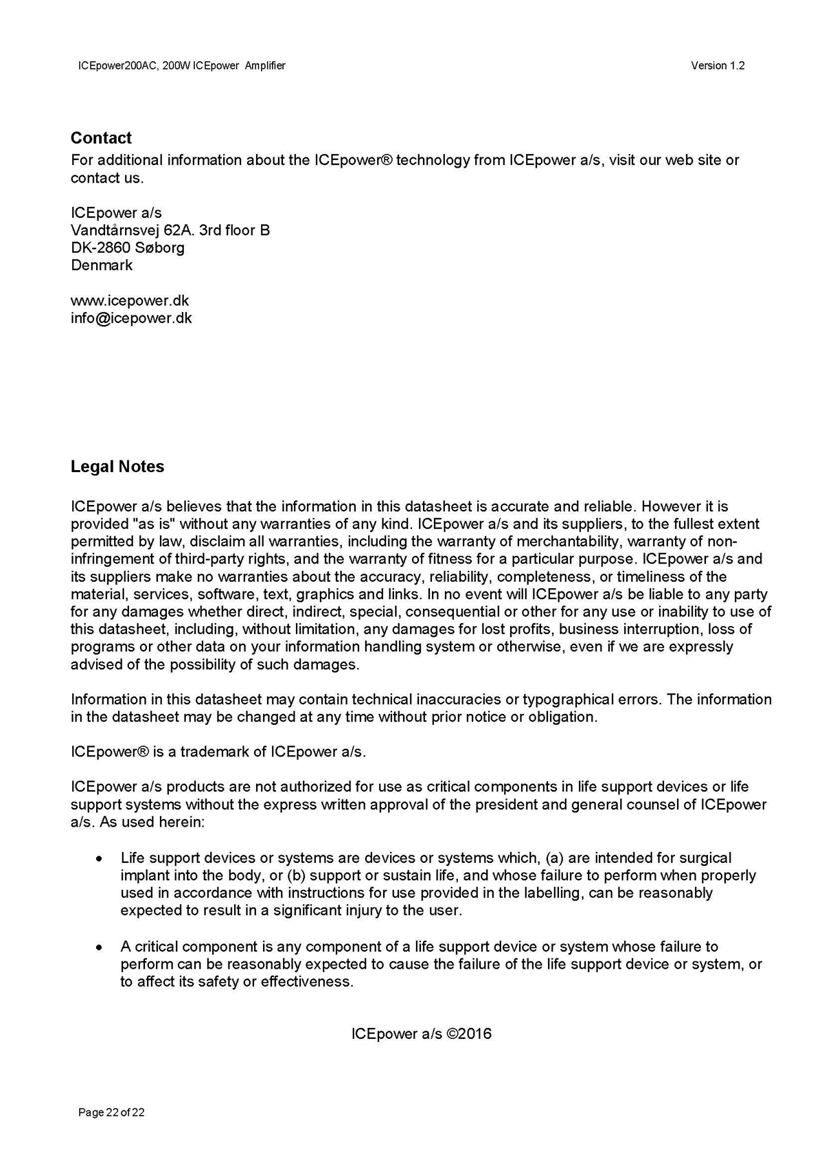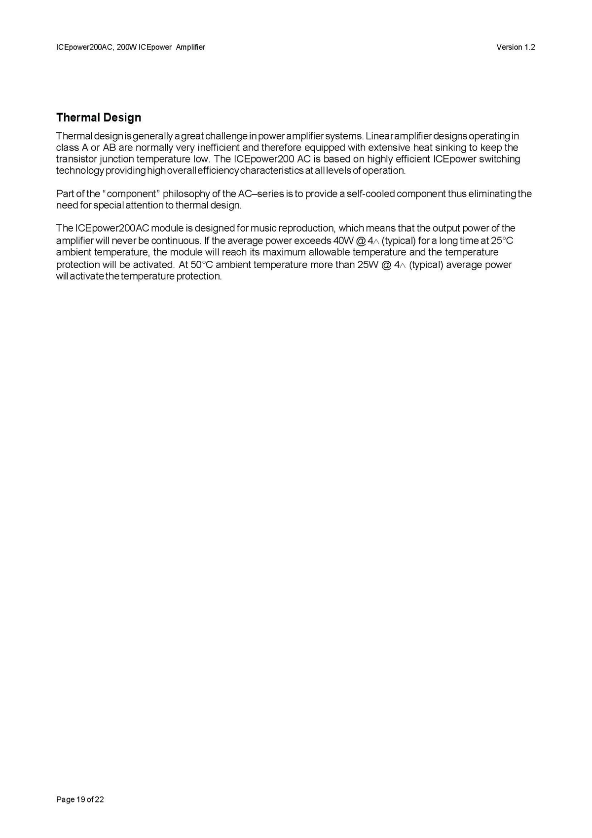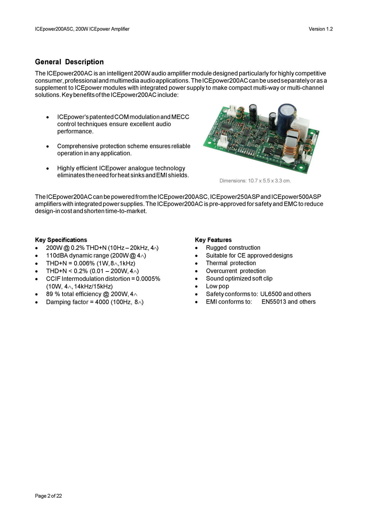 - The 200AC is an intelligent 200W audio amplifier module designed particularly for highly competitive consumer, professional and multimedia audio applications. It can be used separately as a supplement for ICEPower modules with integrated power supply to make compact multi-way or multi-channel solutions.