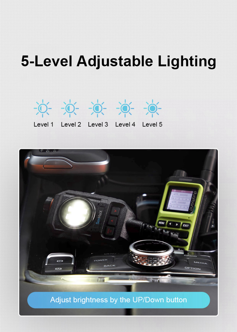 - Adjustable lighting in 5 levels: You can adjust the brightness of the light by pressing the up/down button