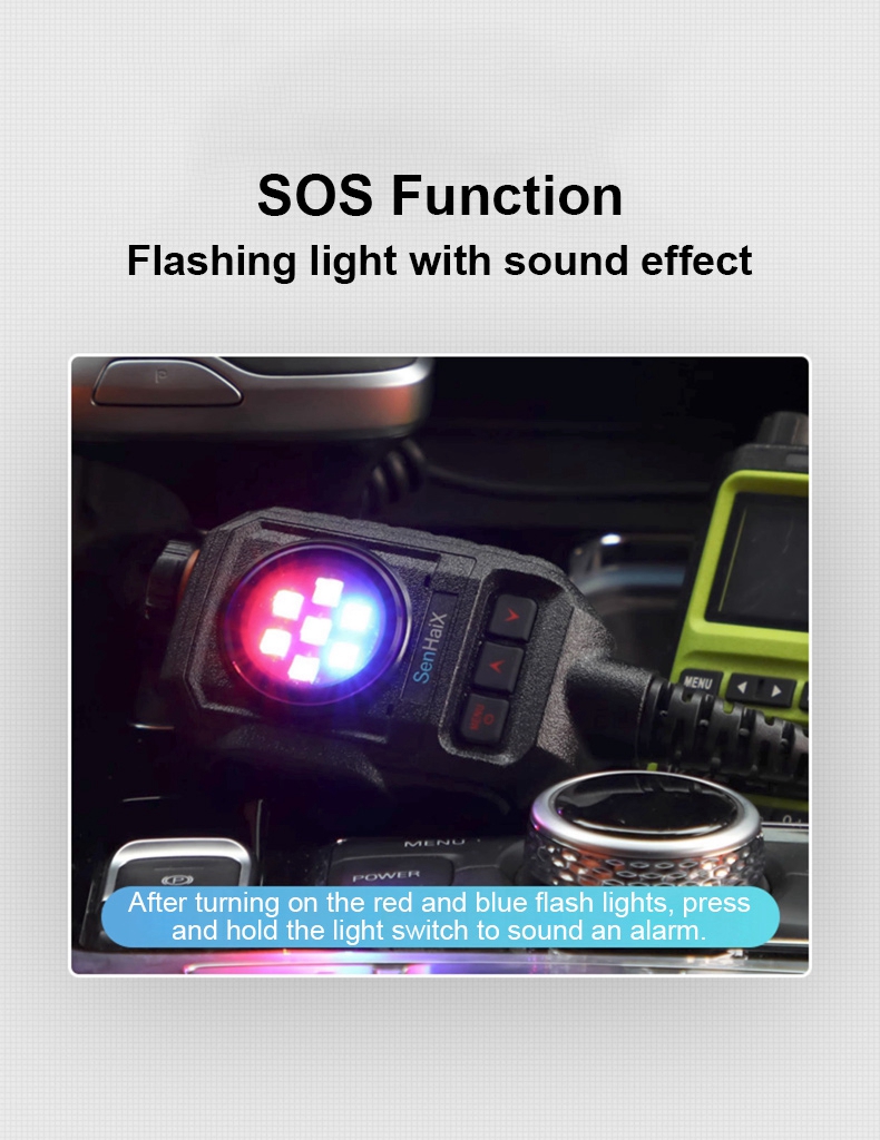 - SOS function: In case of dangerous emergency, it can quickly issue an SOS signal. After turning on the red and blue flash lights, press and hold the light switch to sound an alarm