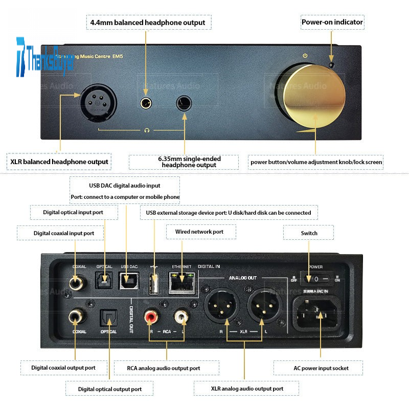 - EM5 was designed as a DAC/AMP for high-end headphones, with a range of different connectors, including balanced XLR and 4.4mm. It can also be used as a DAC and pre-amplifier when combined with a separate power amplifier or active speakers.