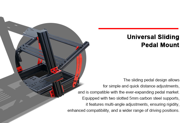 * The sliding pedal design allows for simple and quick distance adjustments, and is compatible with the ever-expanding pedal market. Equipped with two slotted 5mm carbon steel supports, it features multi-angle adjustments, ensuring rigidity, enhanced compatibility, and a wider range of driving positions.