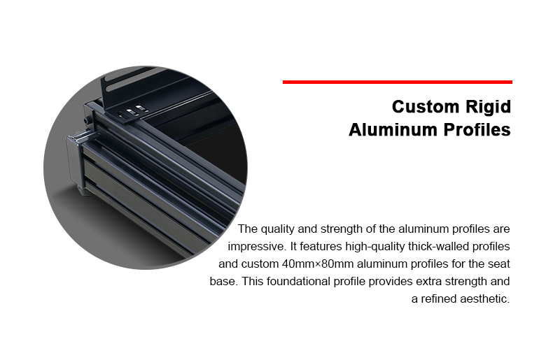 * The quality and strength of the aluminum profiles are impressive. It features high-quality thick-walled profiles and custom 40mm×80mm aluminum profiles for the seat base. This foundational profile provides extra strength and a refined aesthetic.