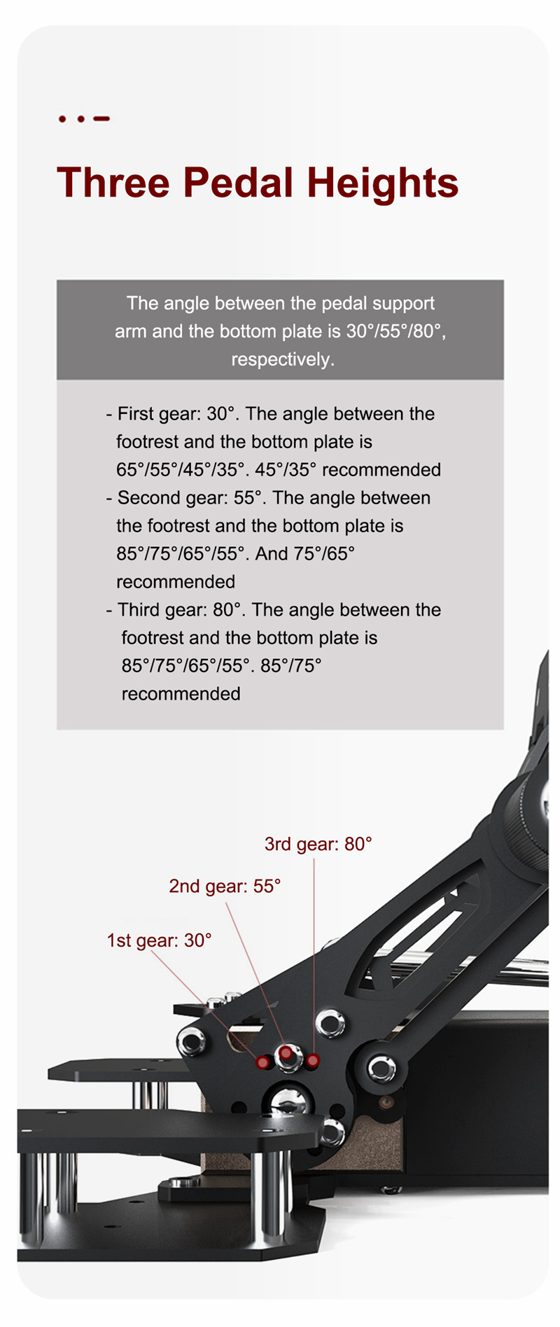 - The angle between the pedal support arm and the bottom plate is 30°/55°/80°, respectively.