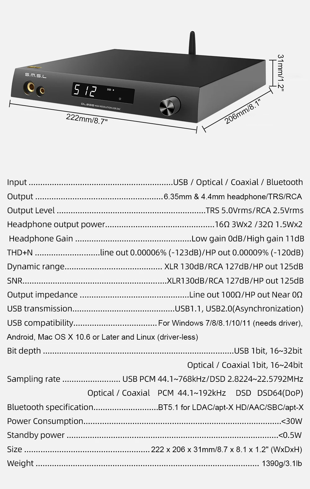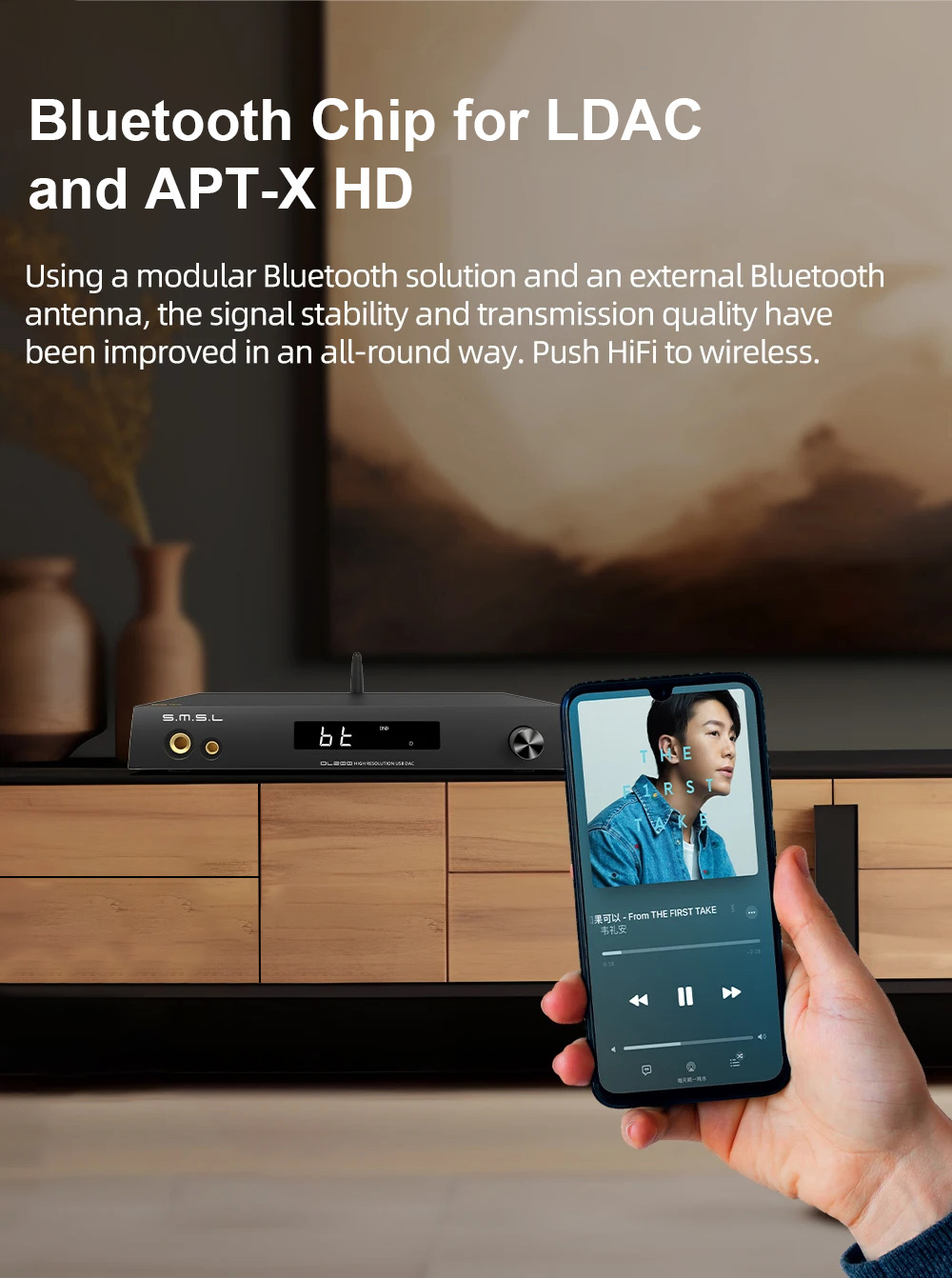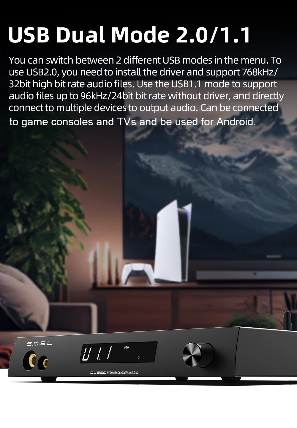 SMSL DL200 USB DAC ES9039Q2M Bluetooth DAC Headphone Amplifier DSD512 for 6.35mm 4.4mm Headphones