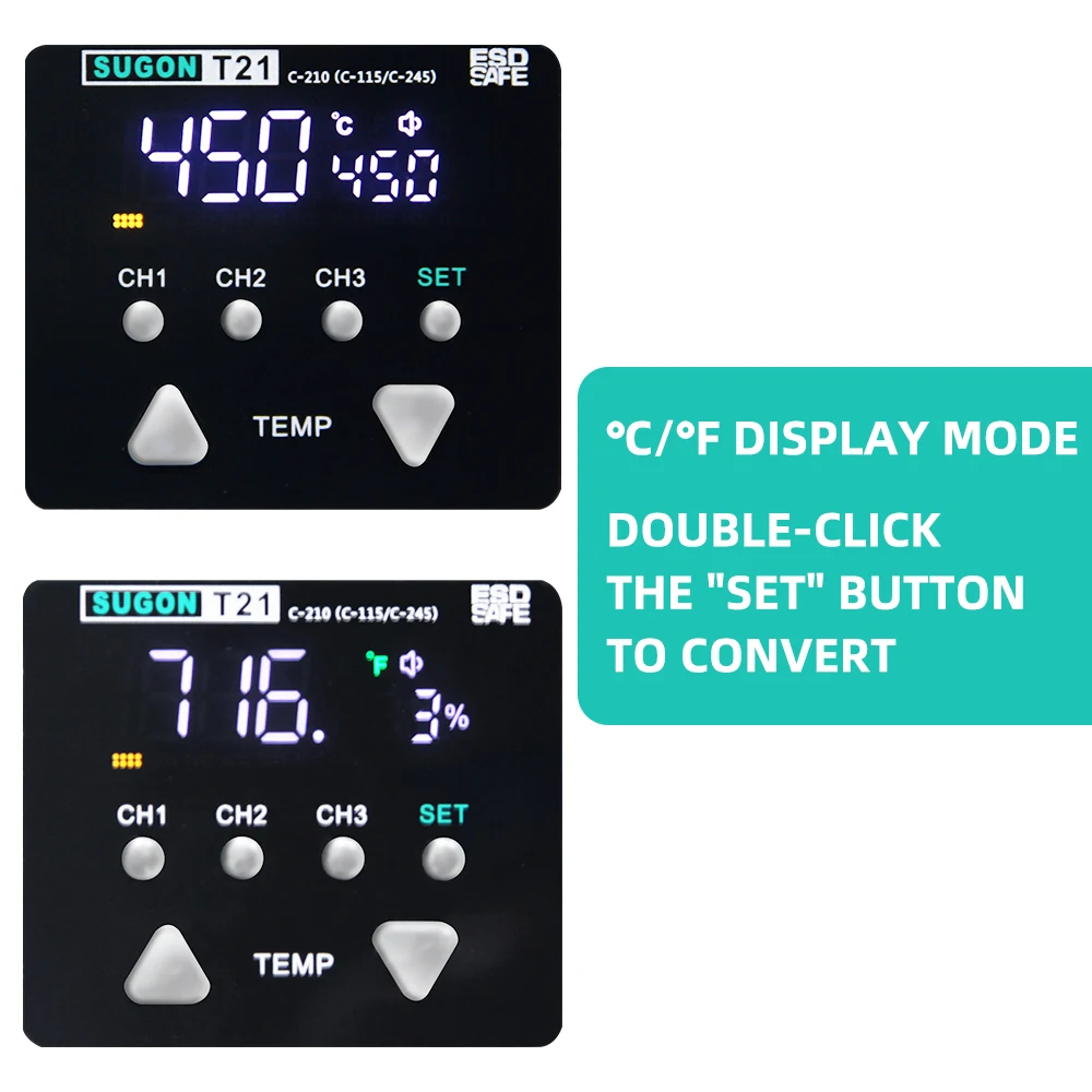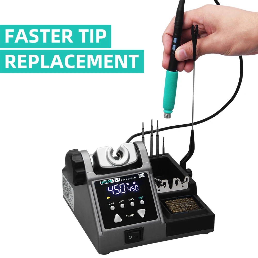 SUGON T21 soldering station uses a program chip to control the temperature, with the latest patented technology. The handle can control and adjust the temperature. Quickly and accurately heat for 2 seconds to melt tin. It is one of the equipment selected by maintenance beginners and professional-level personnel.