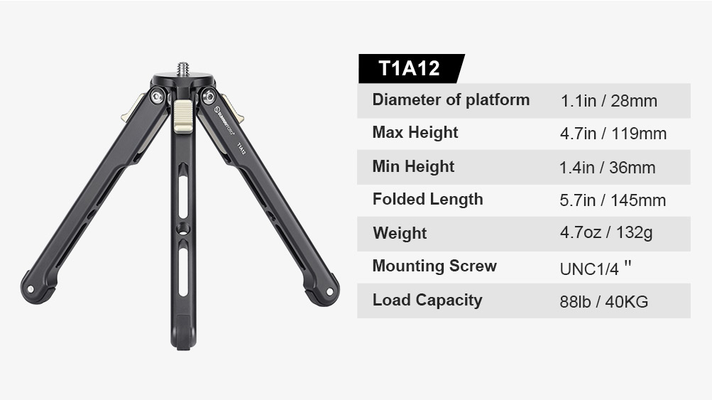 Sunwayfoto T1A12 Table Top Tripod Desktop Tripod Made Of Aluminium Alloy 40KG/88LB Load Capacity
