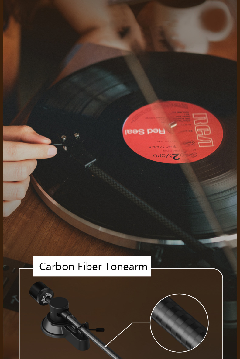 - Its tonearm is made of carbon fiber, which is lighter in weight