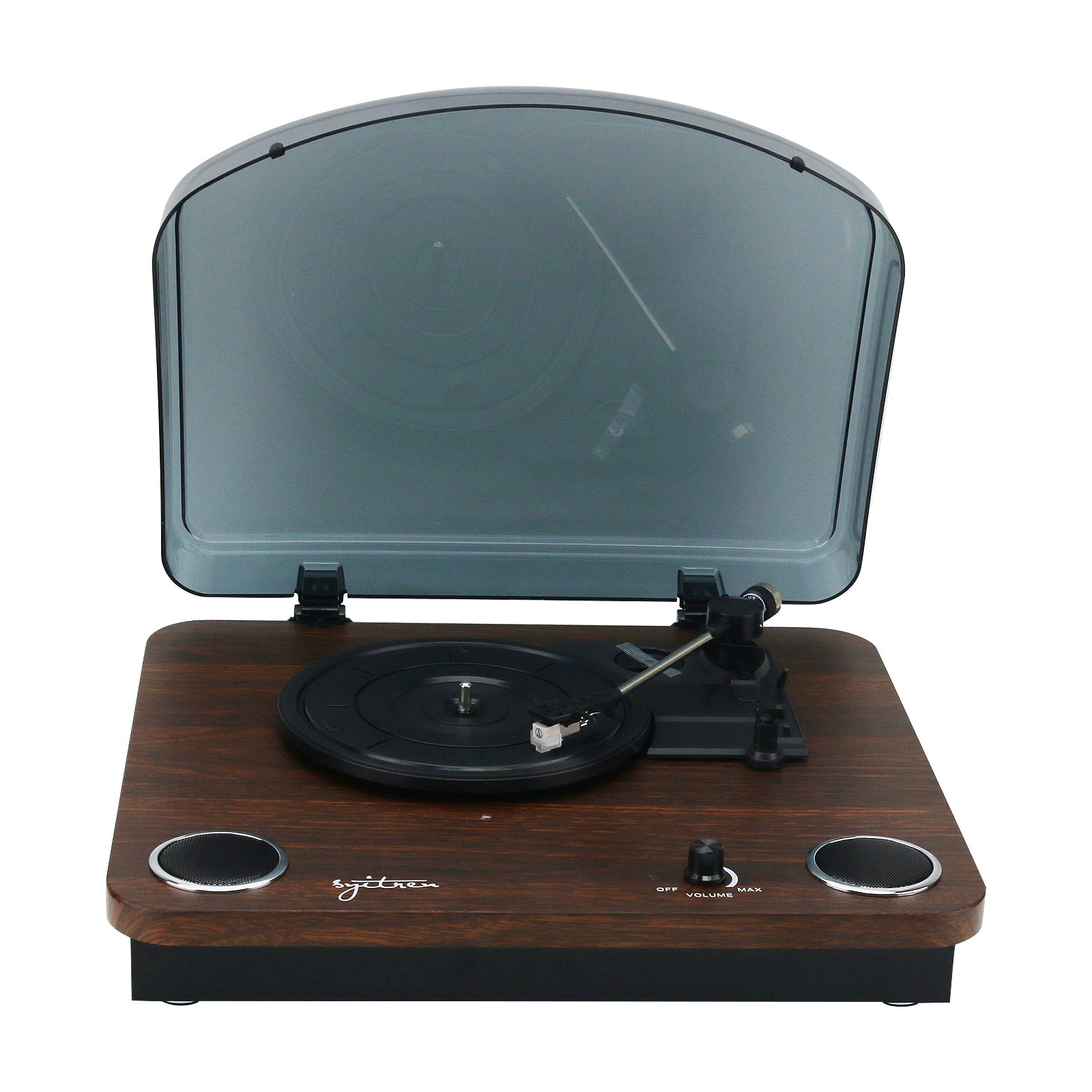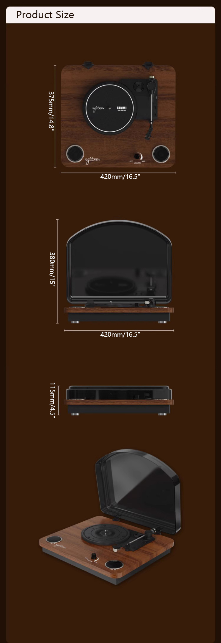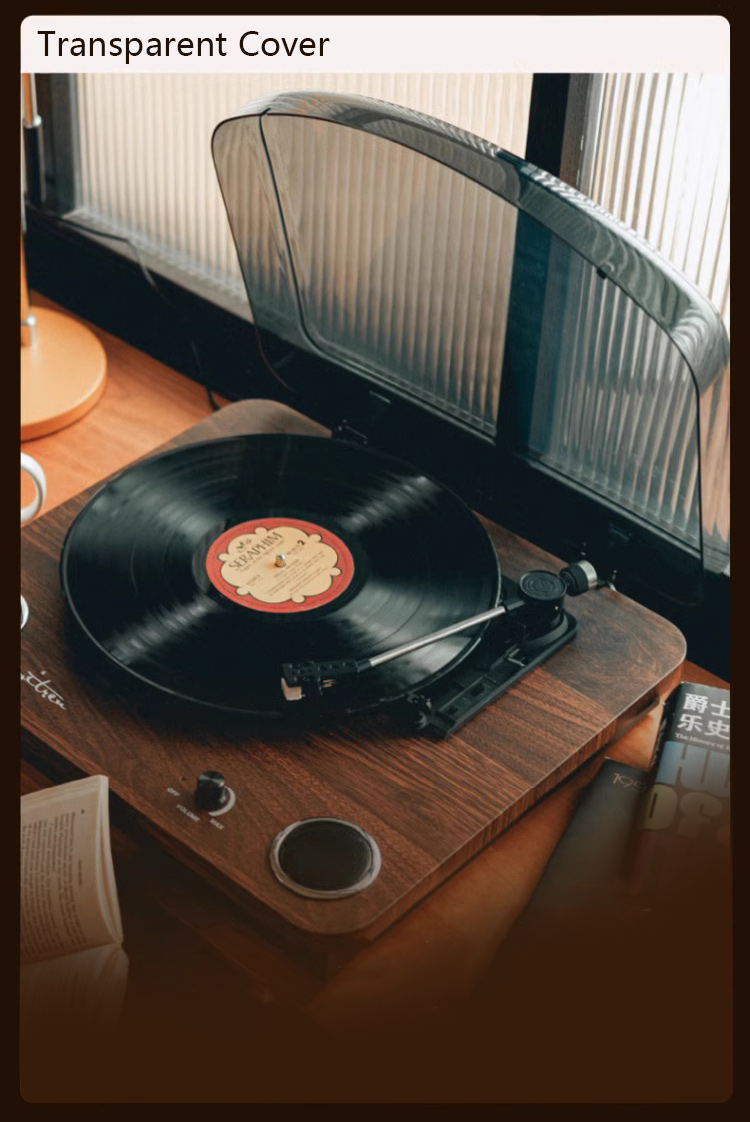- Transparent cover: The vulnerable part of the record player can be covered. Its panel is designed with a volume knob and speakers.