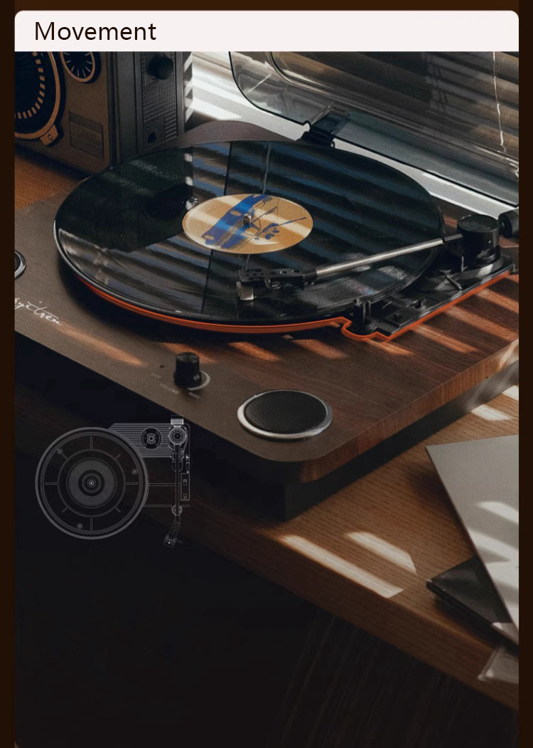 - Its movement adopts a suspended shock absorption design, which makes it more stable to play records.