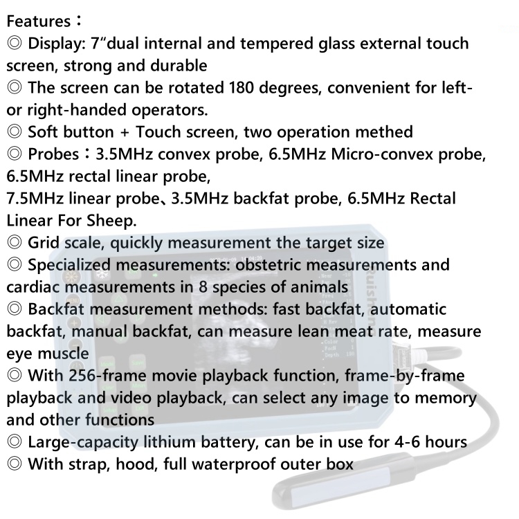 - Supported probe (not included): 3.5MHz electronic convex array probe, 6.5MHz micro convex probe, 7.5MHz high-frequency line array probe, 6.5MHz veterinary rectal linear array probe, 4.0MHz veterinary rectal convex array probe, 3.5MHz back fat probe, 6.5MHz sheep specific probe with handle