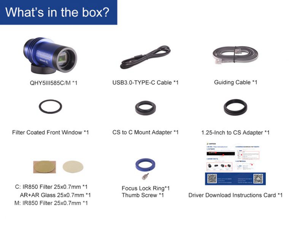 - Equipped with a IMX585 sensor for SONY, QHY5III585M/C is an QHY5III V2 series planetary and guiding camera, the enhanced version of QHY5III485C. It has a high sensitivity in the near-infrared, and the dynamic range performance has been greatly improved. It has a 1/1.2-inch large sensor and excellent characteristics of zero glow. The product comes with filters, including an IR850nm filter.