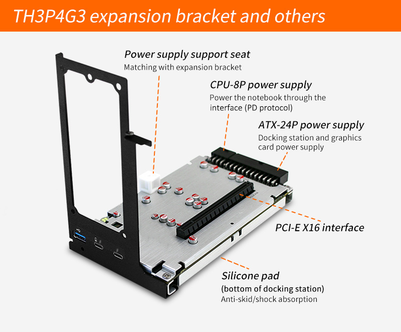 Upgraded version TH3P4G3 GPU Dock is designed for Thunderbolt. If your laptop have interfaces for Thunderbolt-compatible 3 or Thunderbolt-compatible 4, you can use it to connect a external graphics card so that to play game, edit video, process image and so on.