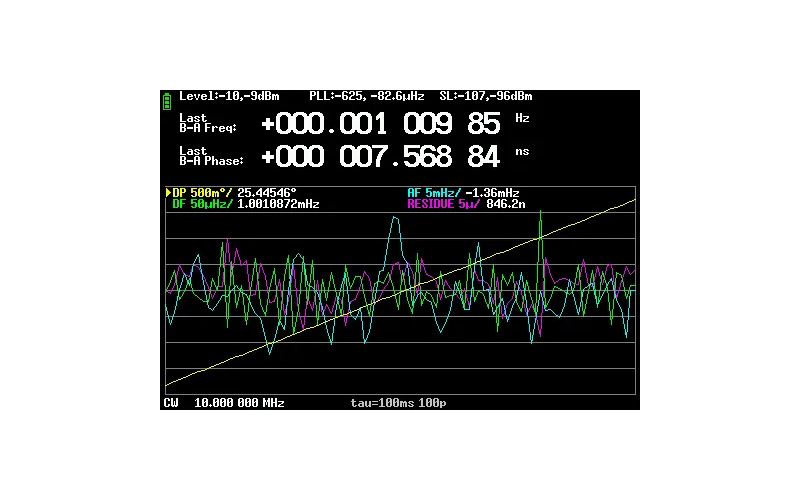 Phase and frequency measurement accuracy is better than 1e-12 per second. Note that the maximum frequency difference that can be displayed depends on the measurement time (Tau), which is approximately 200Hz/s. Therefore, for Tau is 1s, the maximum frequency difference is 200Hz.