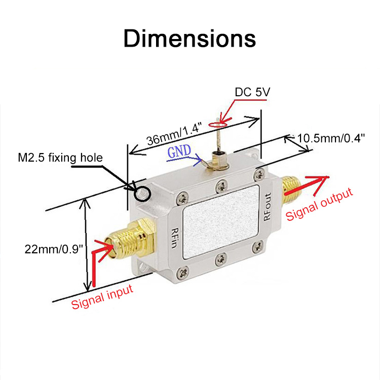 The 5MHz-4GHz low noise amplifier module features high flatness. It can be powered by DC 5V. There is an optional version supporting 5V type-c mobile phone charger, computer USB port, and 5V USB socket of your instruments.