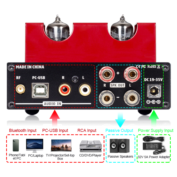 TUBE-T6C 160Wx2 HiFi Bluetooth Tube Amplifier DAC Bluetooth 5.0 Lossless Input w/ 32V 5A Power Adapter
