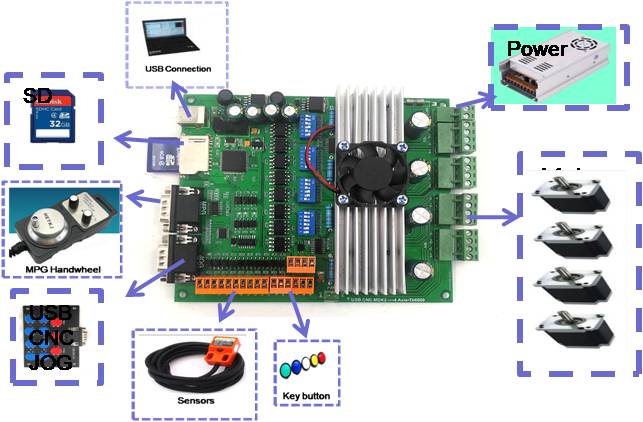 1. Support for 4-axis linkage, you can connect four stepper motor drives or servo drives
