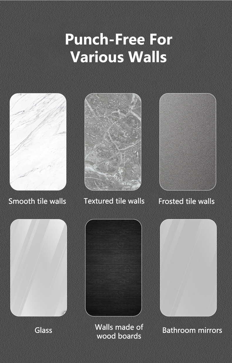 - Punch-free. Can be used for smooth tile walls, textured tile walls, frosted tile walls, glass, wood board walls and bathroom mirrors