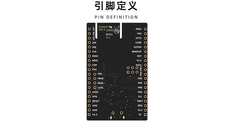 - Pin 36: EXTON. Function: The EXTON pin on BU01 is connected to PB14 of MCU, and the external device is enabled. Set during wake-up and remain active until the device enters sleep mode. Can be used to control external DC-DC converters or other circuits that are not needed when the device is in sleep mode to minimize power consumption