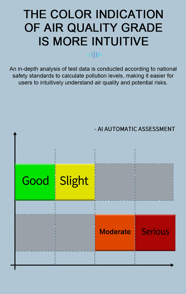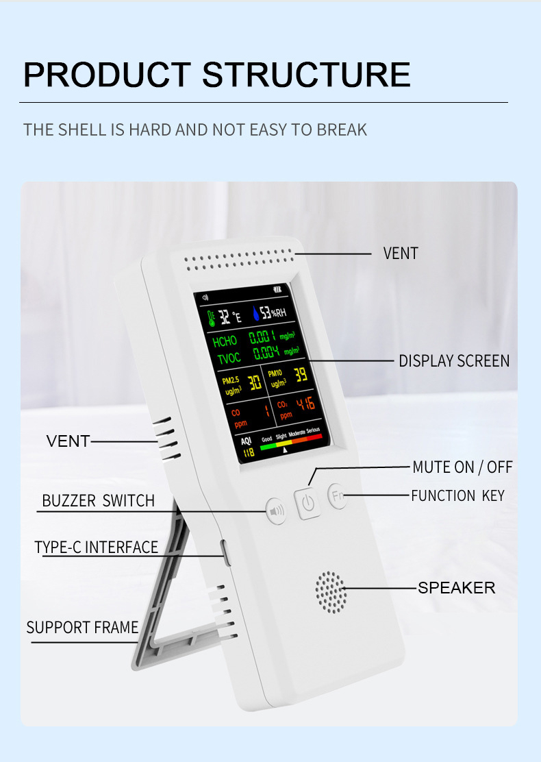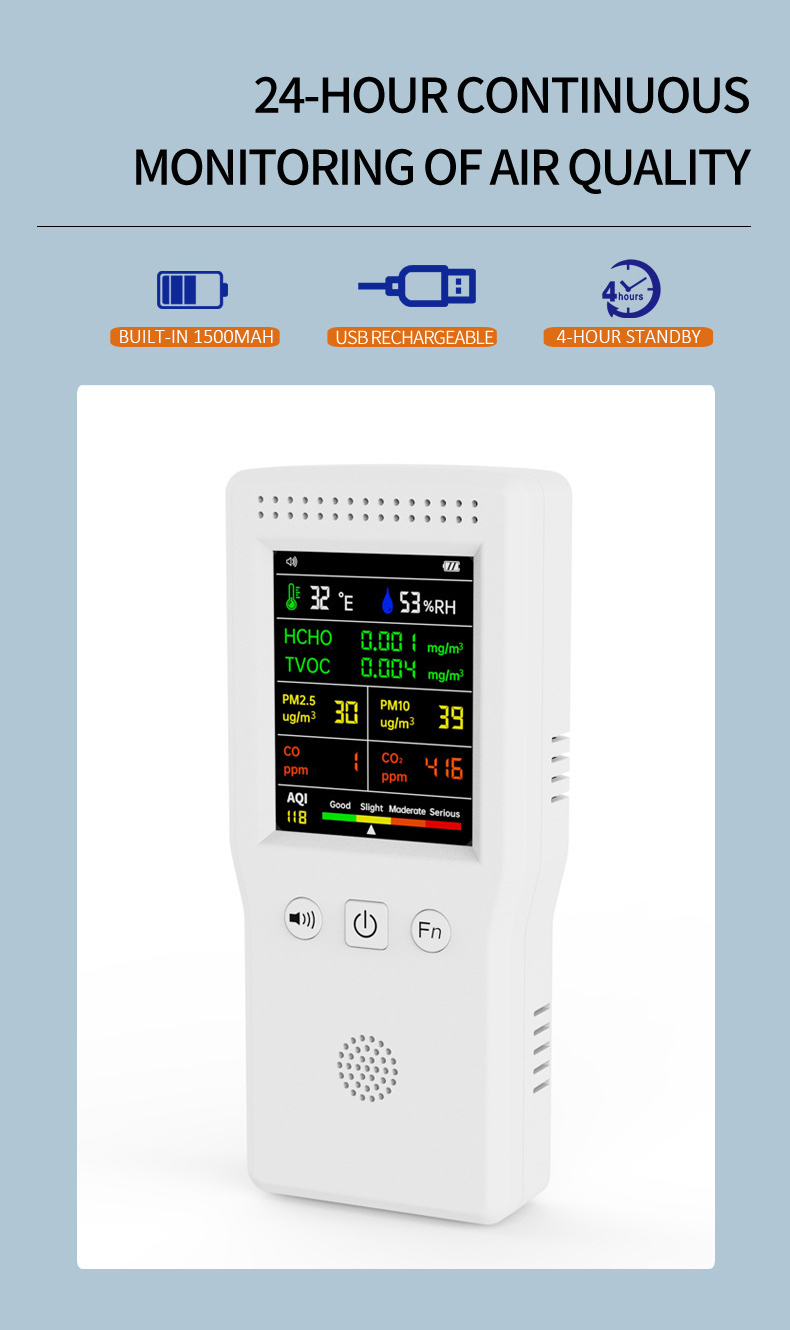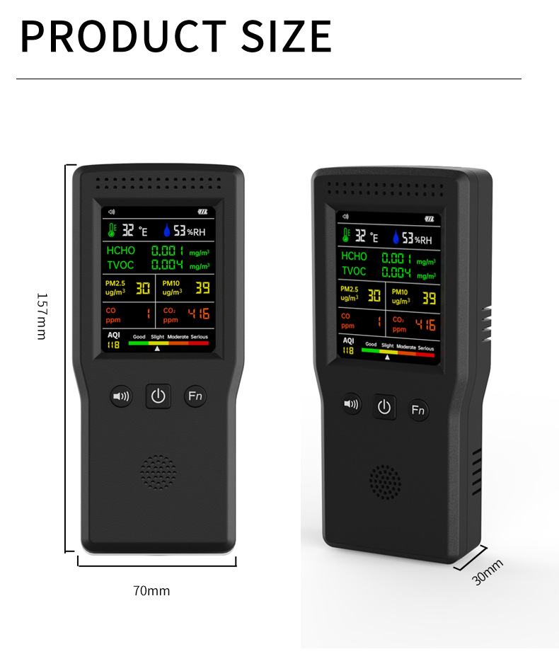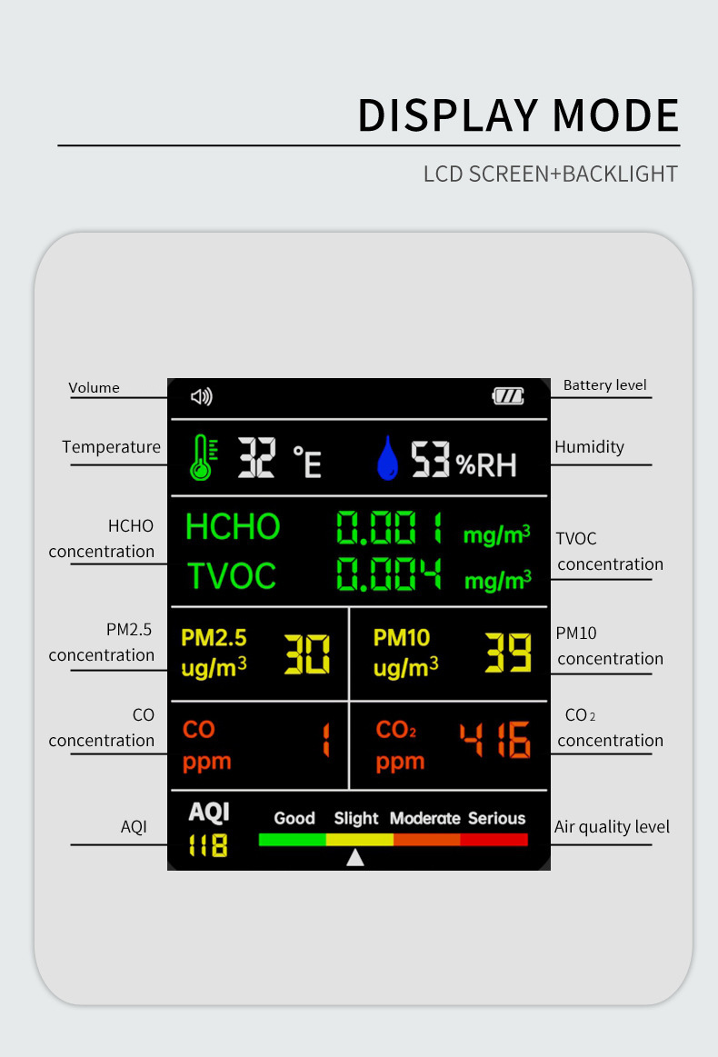 * Test items: Temperature, Humidity, PM2.5, PM10, HCHO, TVOC, CO, CO₂, AQI