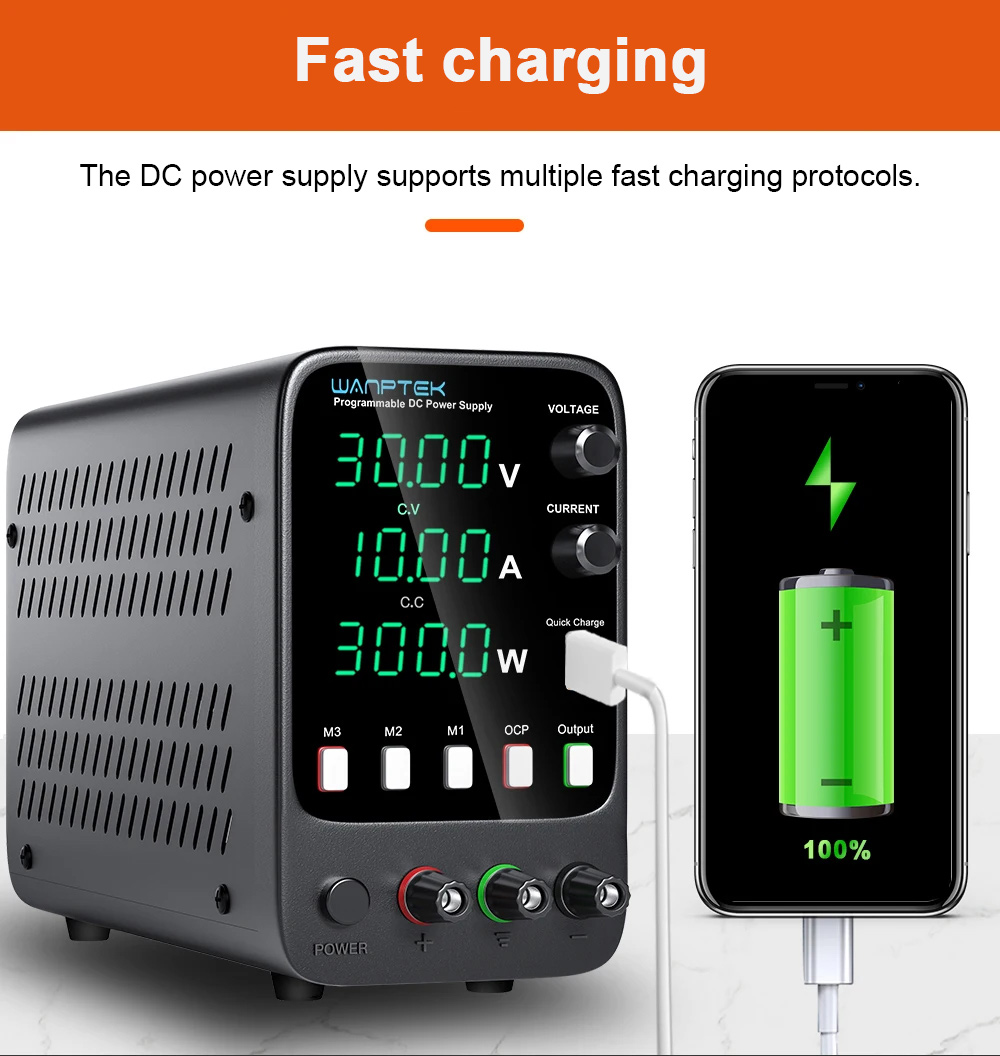 - Auxiliary functions: USB fast charging, output on/off, USB upper computer communication (optional) and data storage
