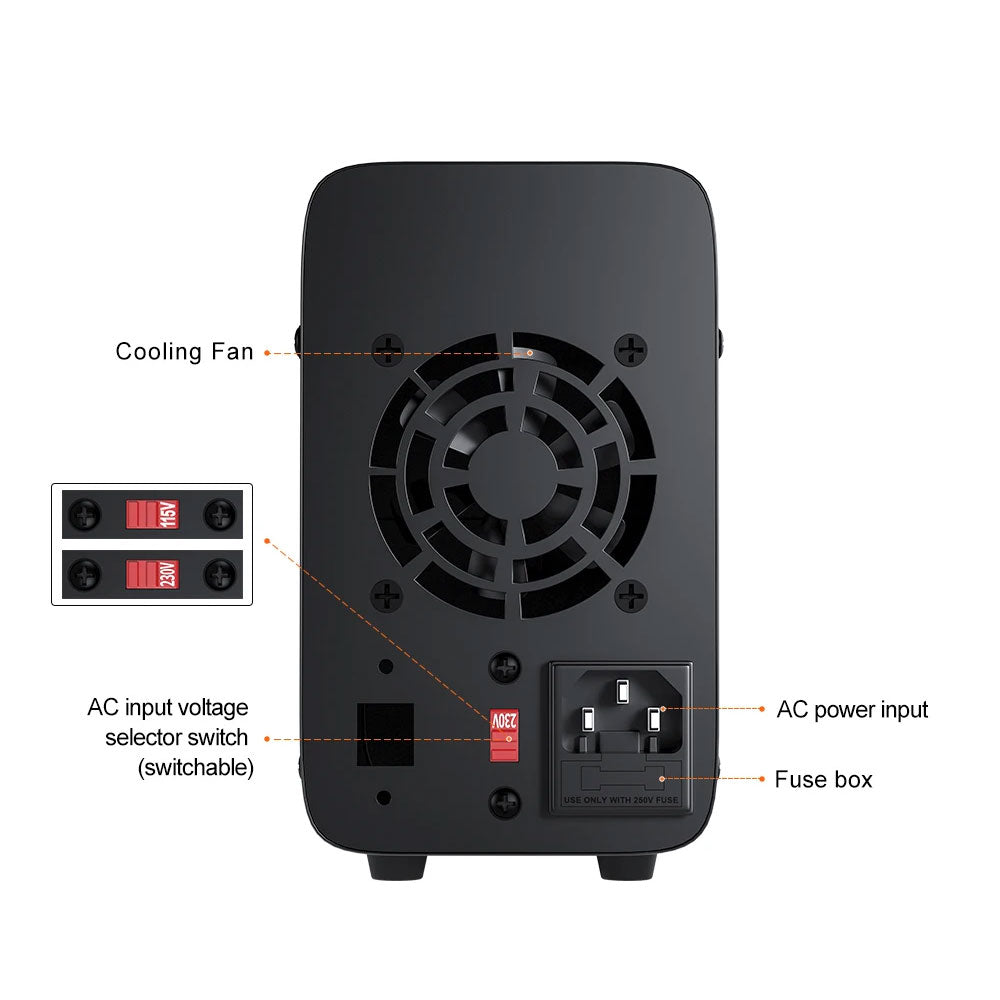 It is a miniature switching DC power supply. The output voltage and current can be controlled and adjusted by variable resistors respectively, so it provides more convenience and accuracy in the adjustment of voltage and current. The panel also provides high-precision three-window four-digit display of voltage, current and power, so that users can intuitively see the current use status and various parameters of the machine.