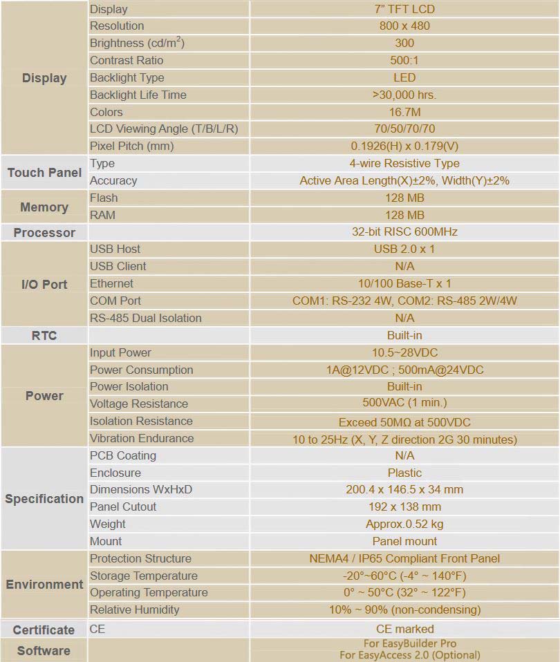 - 7" 800 x 480 TFT LCD, LED Backlight
