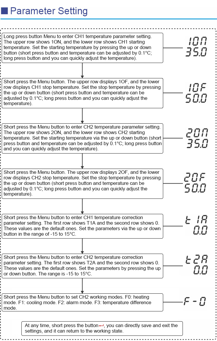 - Cooling and heating can be set for CH1 temperature control. And working modes of CH2 can be set: F0: heating, F1: cooling, F2: alarm and F3: temperature difference.