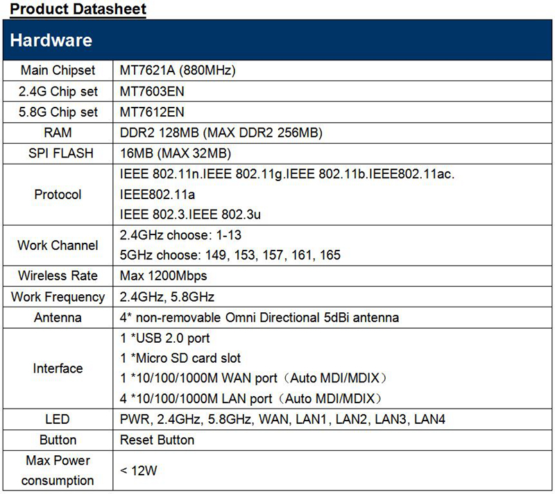 Used new MT7621 wireless solution, it performs better with more functions. Stable wireless performance, stronger scalability, the Max transmission rate could be 1200Mbps, 2.4G 300Mbps, 5G will be 867Mbps, providing 1* USB2.0 interface, 1*TF Micro slot.
