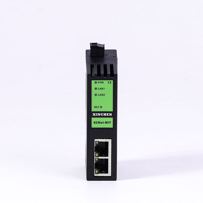 - Installed on a 35mm rail, LAN1 is a dual port RJ45 with switch function, which is connected to the PLC; LAN2 is a single port RJ45 that can be connected to a touch board or upper computer system; XCNet MIT is powered by an external 24VDC power supply.