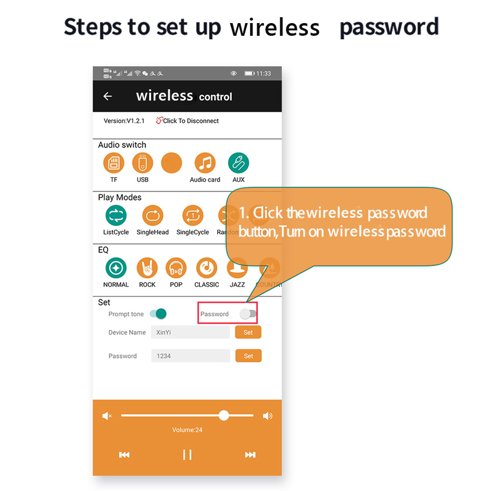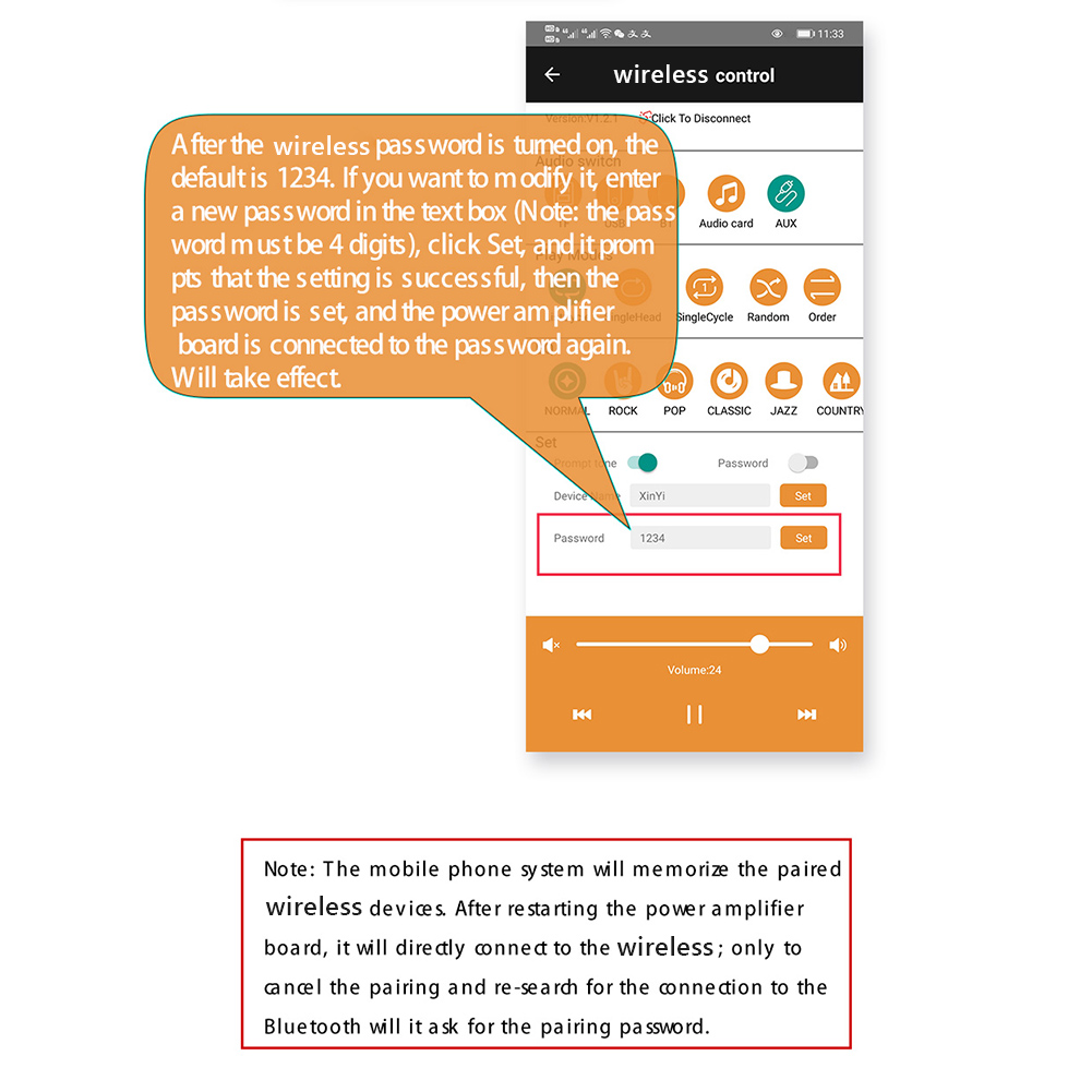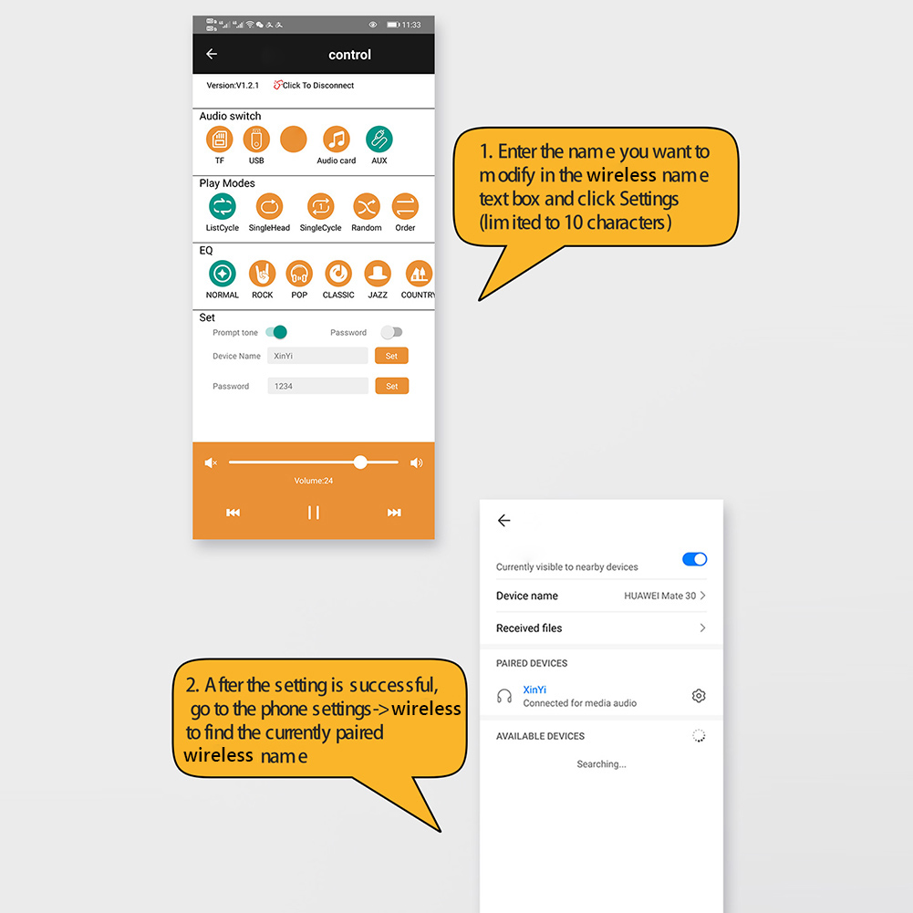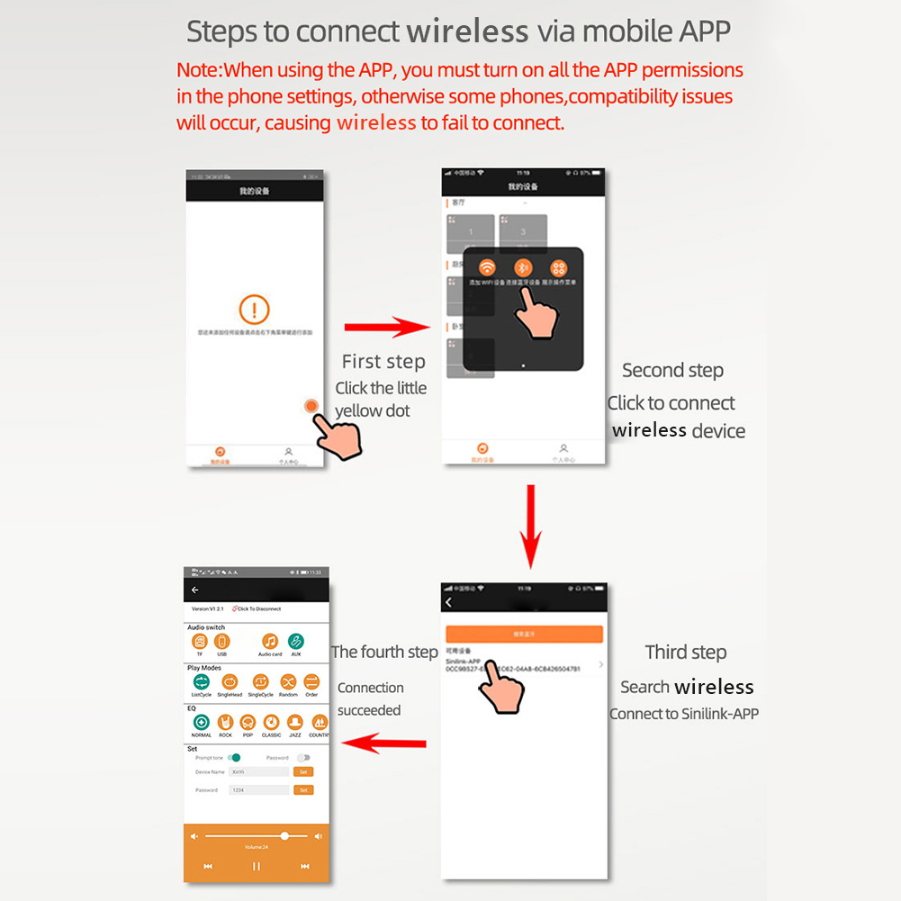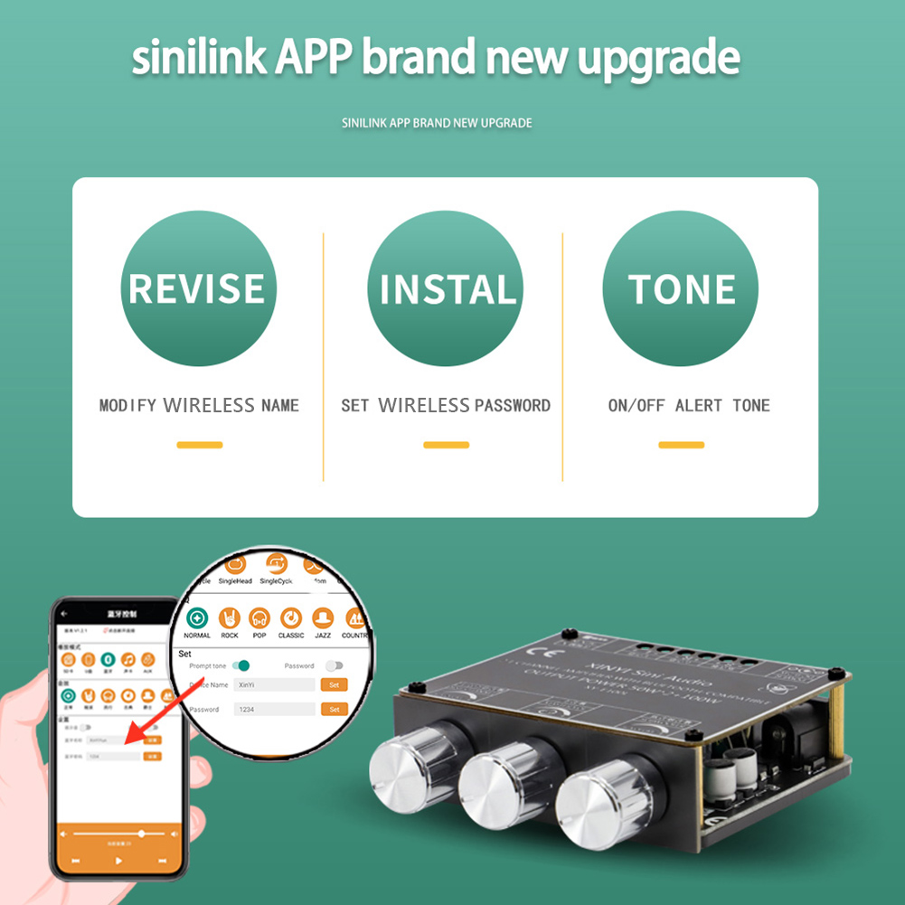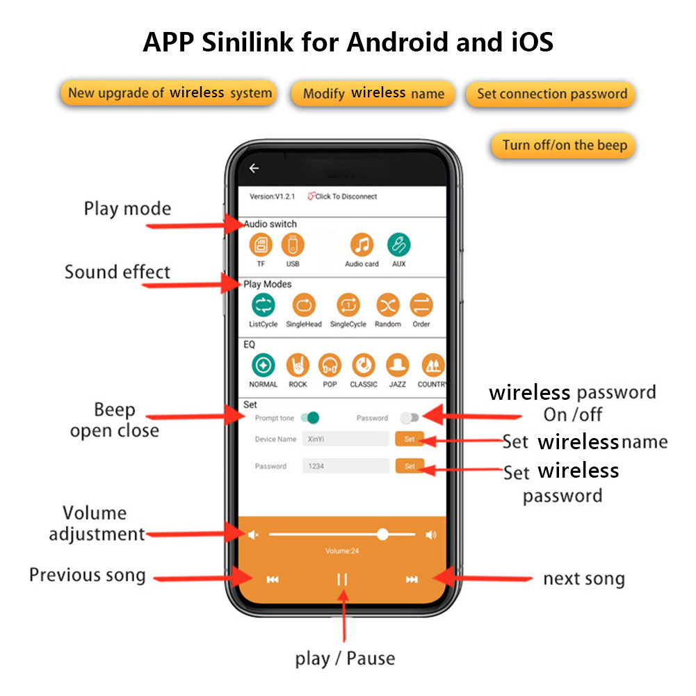 4. Support mobile app control: newly upgrade Sini link app; Support to modify Bluetooth-compatible name; Set Bluetooth-compatible password; Off / on tone