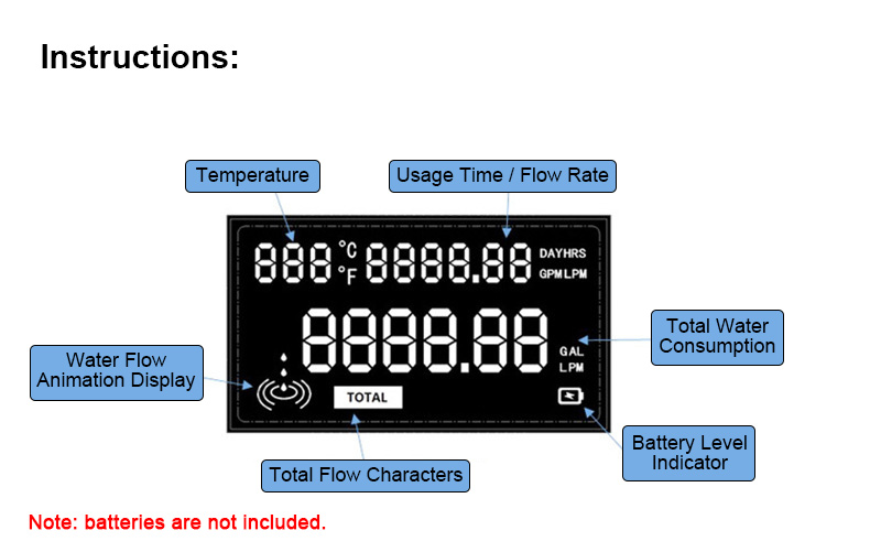 * Flow rate units: LPM means Liters per minute. And GPM represents Gallons per minute. You can switch the flow rate unit by short-pressing the "-" button.
