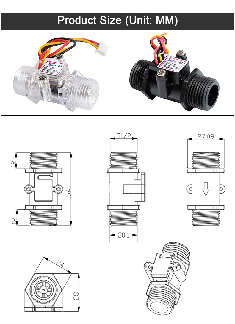 YF-S201C 1-30L/min Transparent Hall-Effect Water Flow Sensor G1/2 Water Flow Meter for Water Heaters