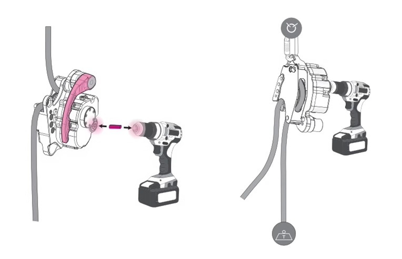 The Z3 series is an innovative electric ascent and descent device. Both the Z3 and Z2 series are powered by a drill. However, unlike the Z2, the Z3 employs a rope-clamping mechanism that provides smooth, impact-free lowering, similar to traditional descenders. The Z3 series also features a proprietary dual self-locking system—if the primary ratchet lock fails, a built-in backup system automatically engages during a fall, greatly enhancing safety.