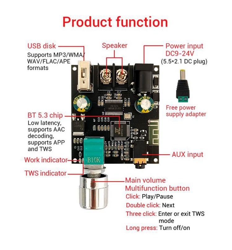 - Adaptive speaker: 4 - 8ohm, 5 - 30W