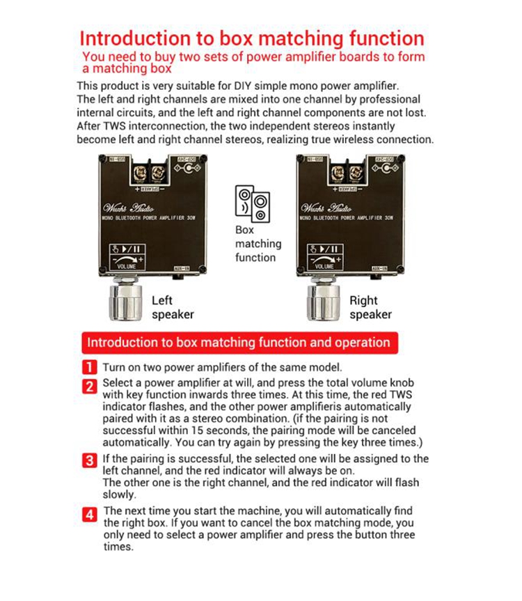 - If using a 4ohm speaker, please use a 12V power supply. It will be damaged if the voltage is too high.