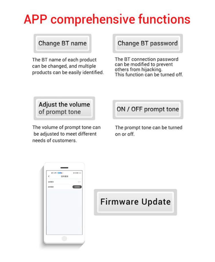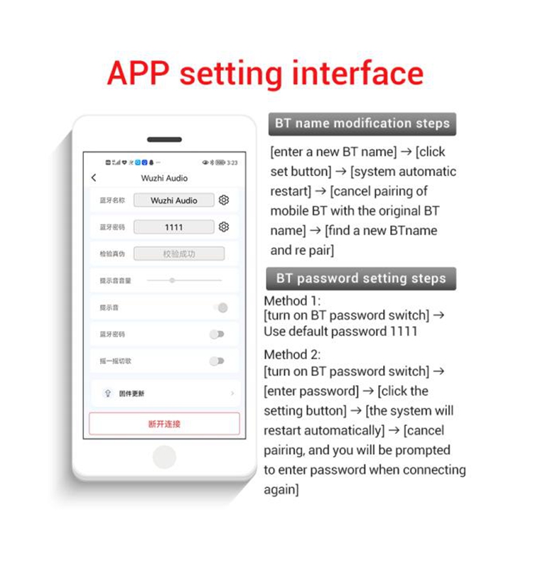 Support Wuzhi Audio APP. Modify BT name, password setting, volume adjustment of prompt tone, on/off prompt tone, sleep music, firmware upgrade, etc.