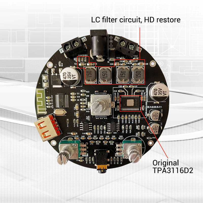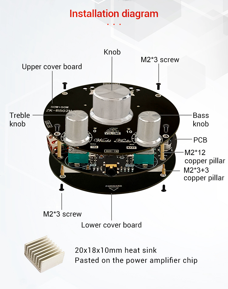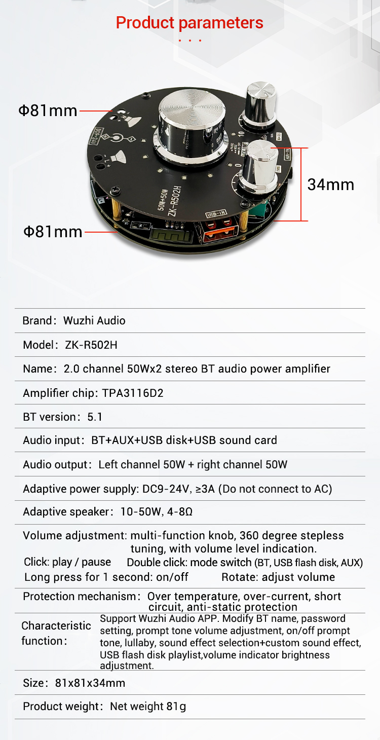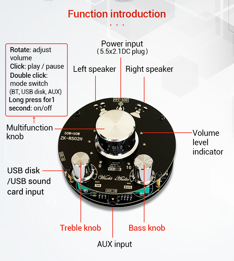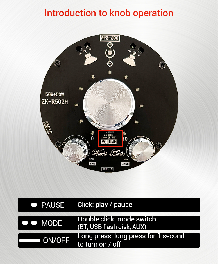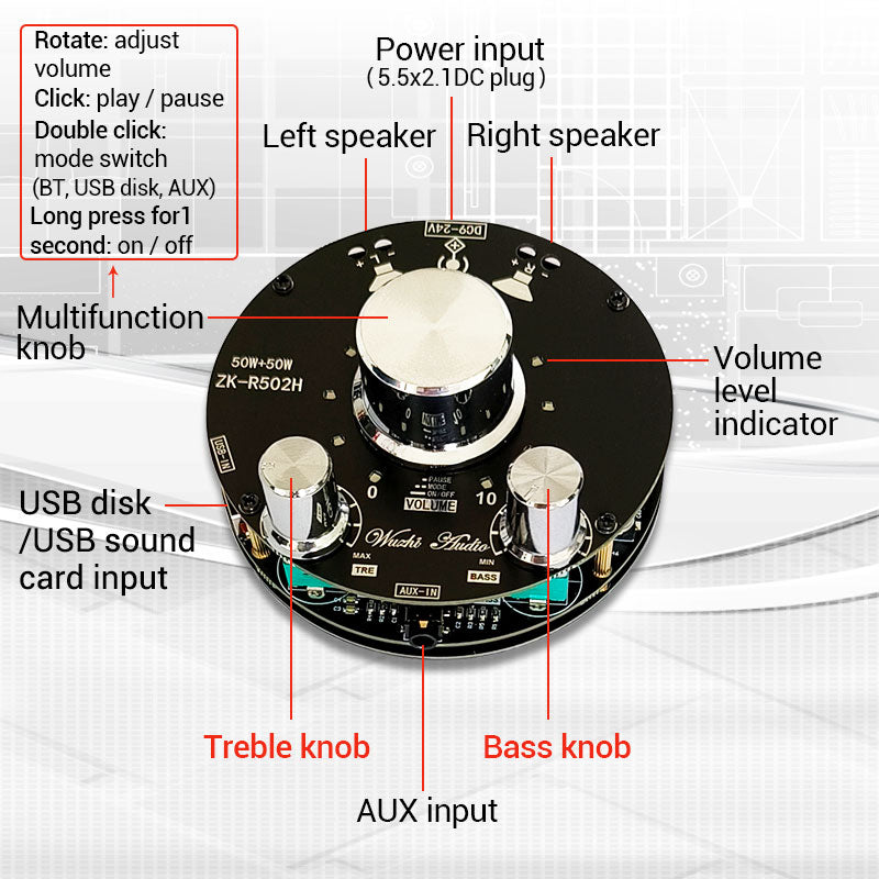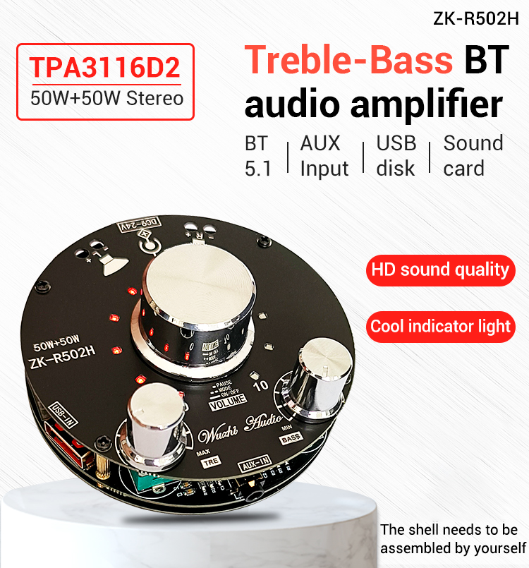 ZK-R502H 50Wx2 Bluetooth Amplifier Board Power Amp TPA3116D2 w/ Volume Indication Bass Treble Knobs