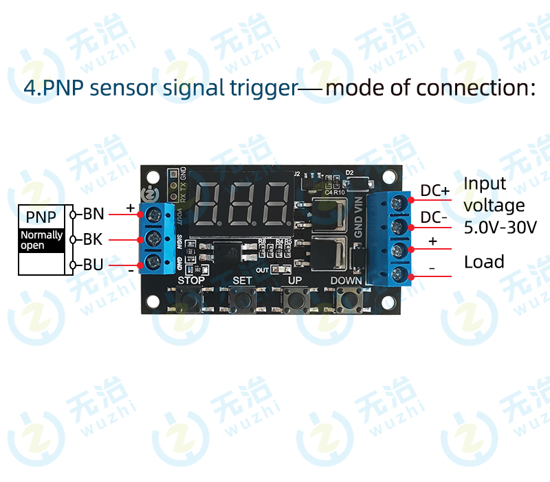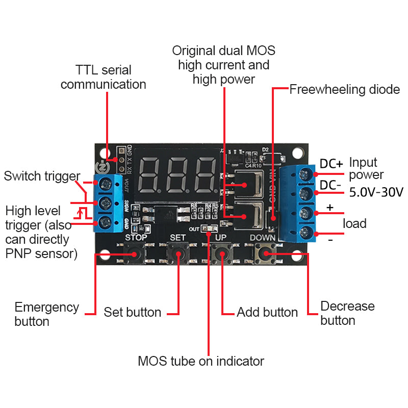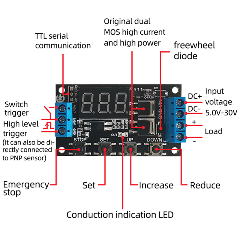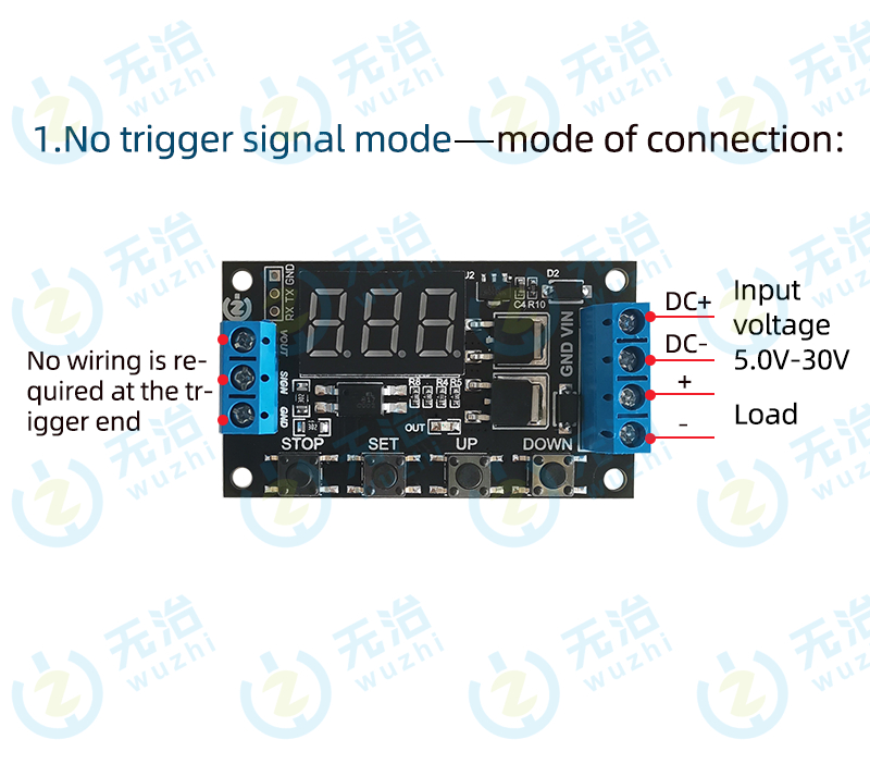 1. The module is an active live output, and the voltage at the output end (load end) is equal to the input end voltage (DC5V-30V).