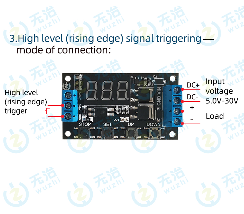2: Trigger signal source: high level trigger (DC3.0V-24V) The signal ground and the system ground are not in the same ground to improve the anti-interference ability of the system (also can be short-circuited to the common ground)