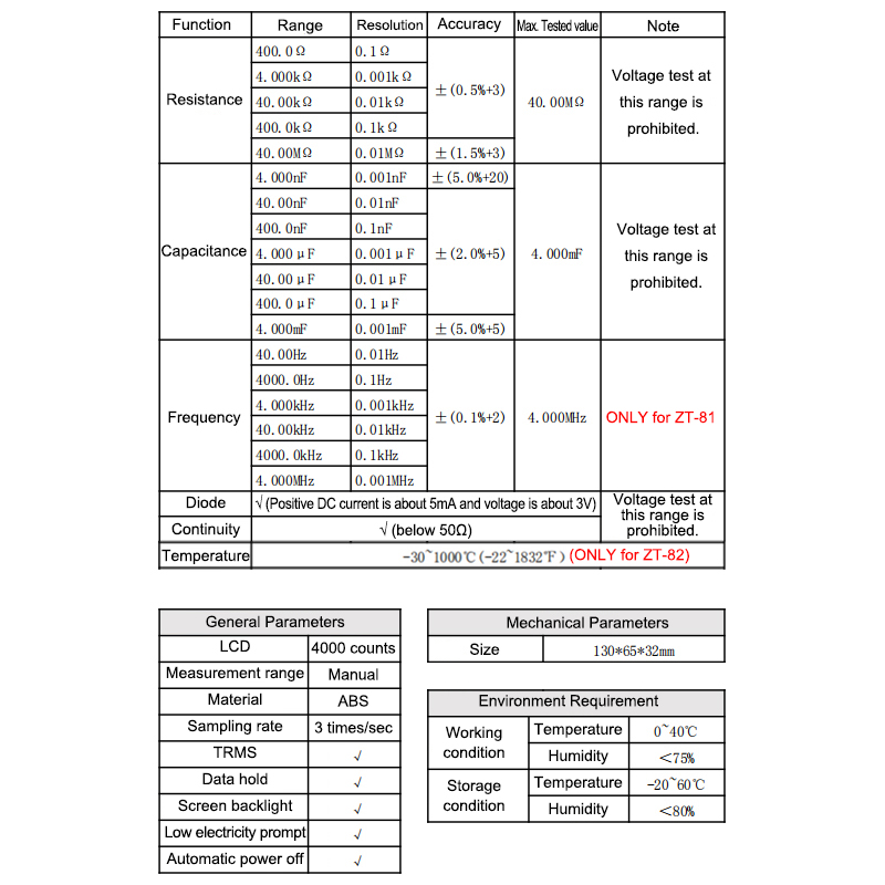 ZOYI ZT-82 4000 Counts Multimeter Tester Portable Automatic Ranging Multimeter to Measure Temperature