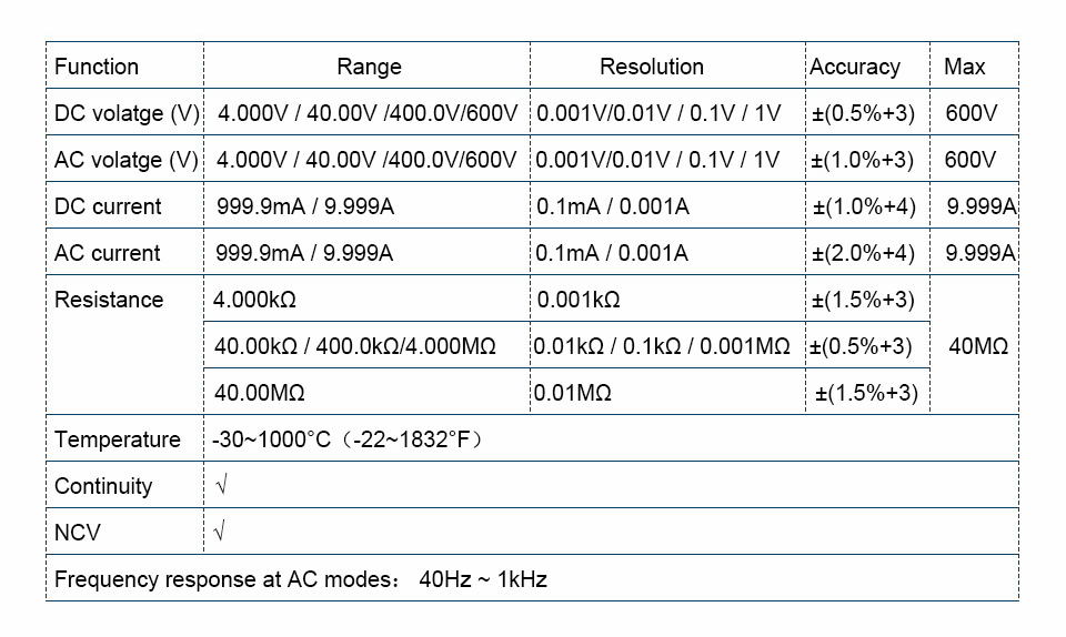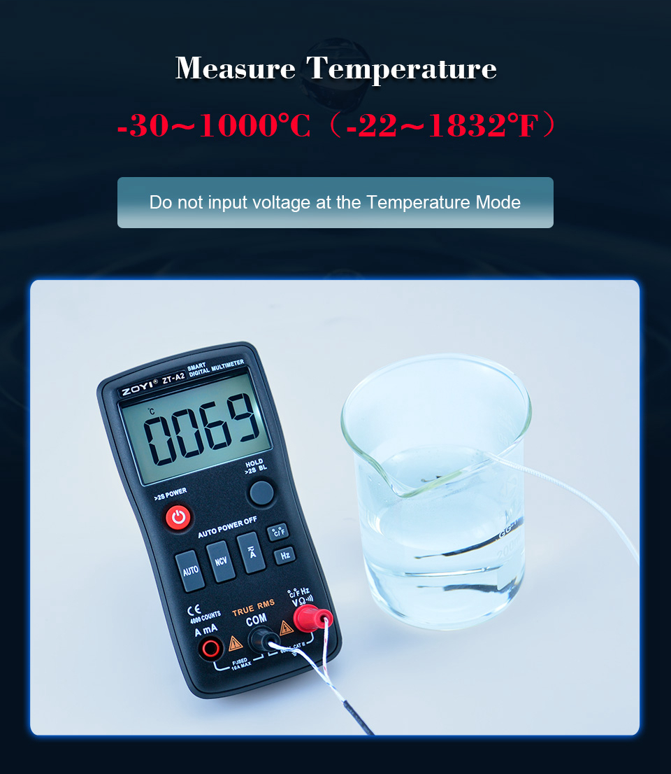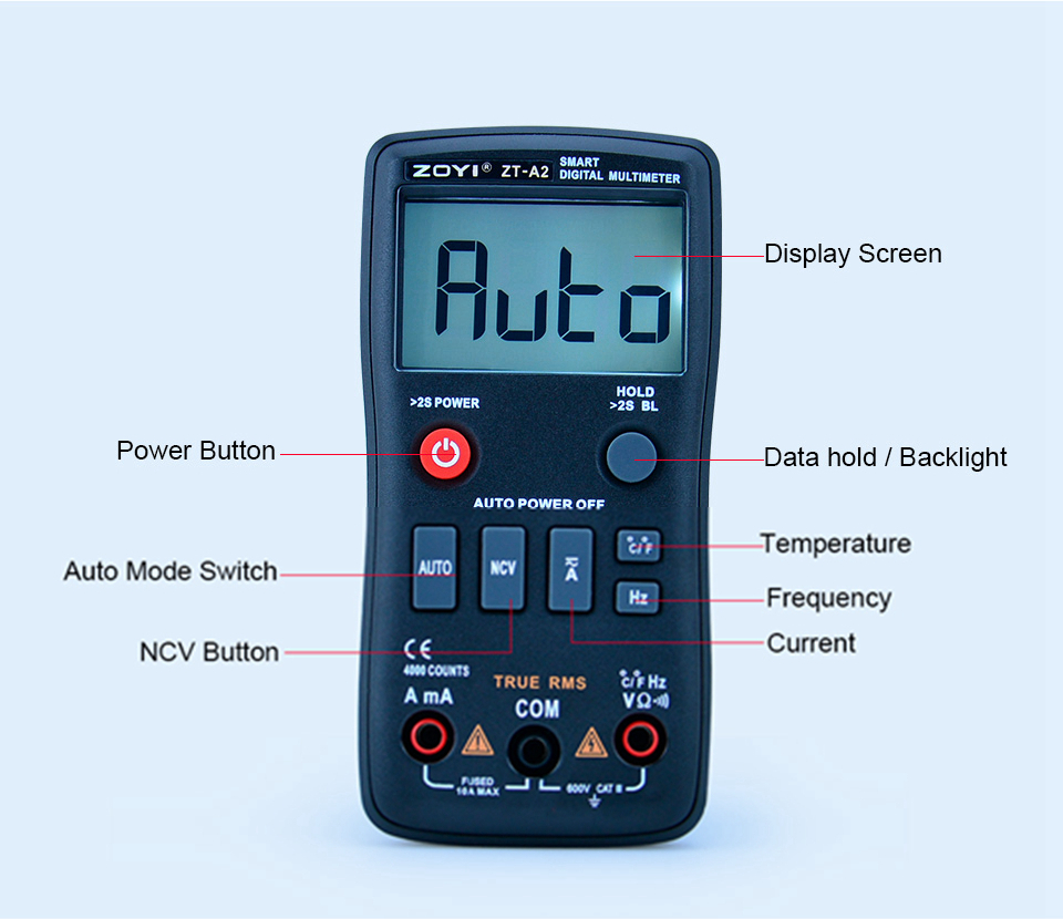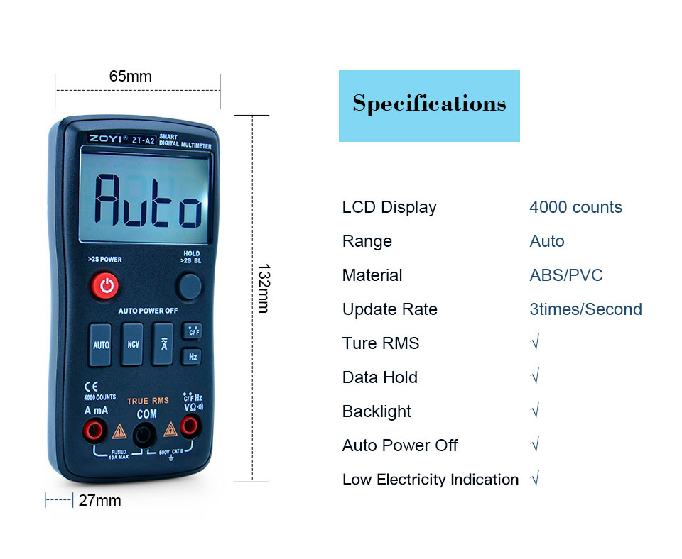 ZT-A2 is an affordable digital multimeter with a thermocouple, an ideal tool for students, new users, and electricians. CAT Ⅲ 600V, TRUE-RMS multimeter that includes an easy-to-use interface with buttons. One-hand operation is easy to change functions. You can get all the measurements for: