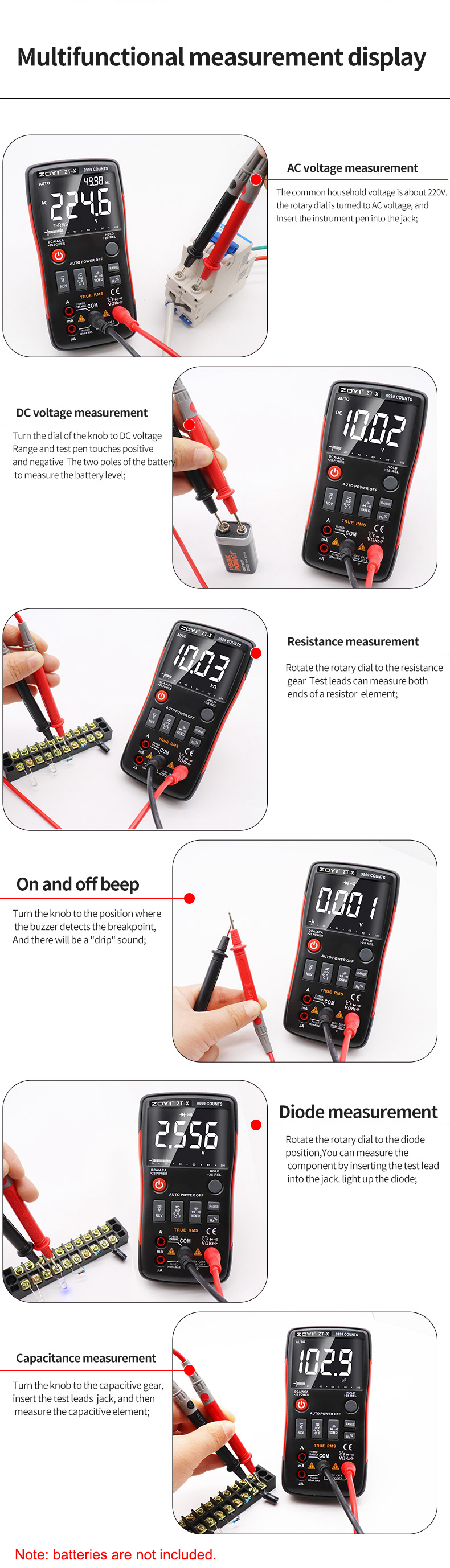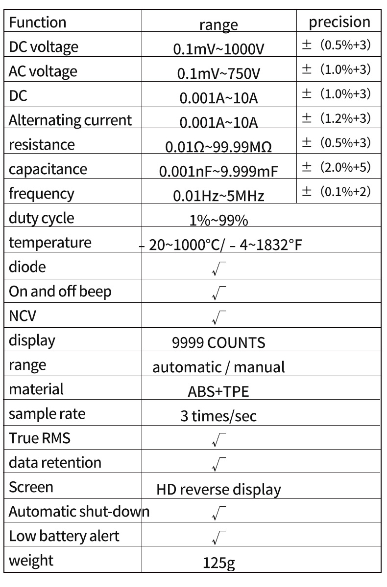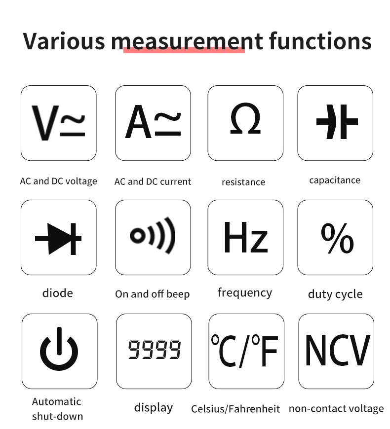 1. Multi-function: can measure AC / DC voltage, AC / DC current, resistance, capacitance, frequency, duty cycle, temperature, NCV, diode and continuity.