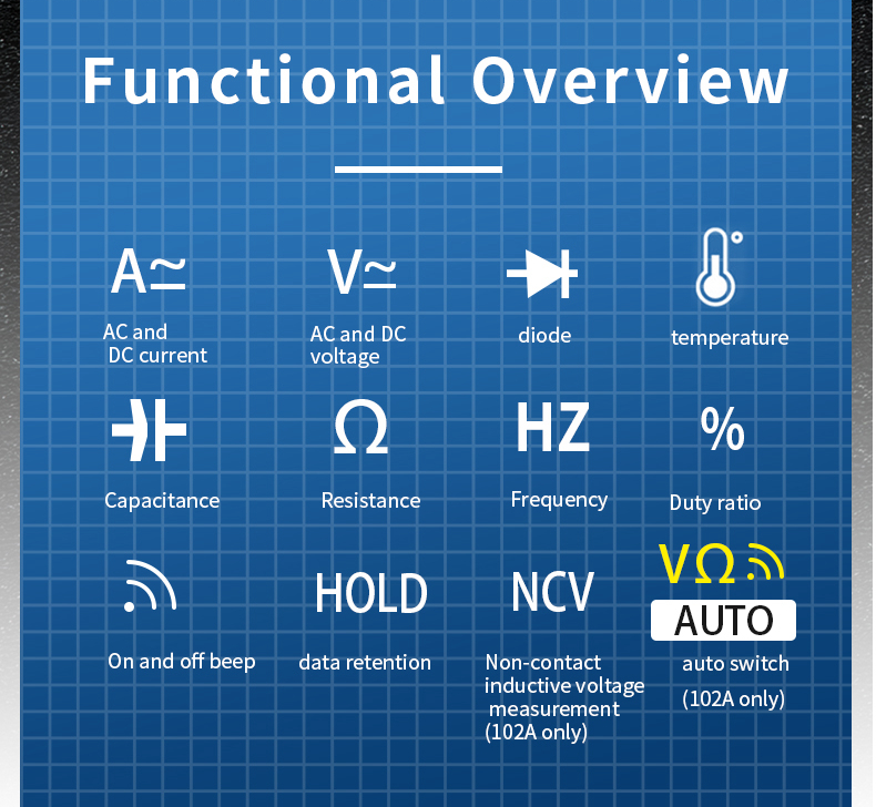 1. Measurement functions include AC/DC voltage, AC/DC current, resistance, diode test/continuity, NCV, frequency/duty cycle, capacitance
