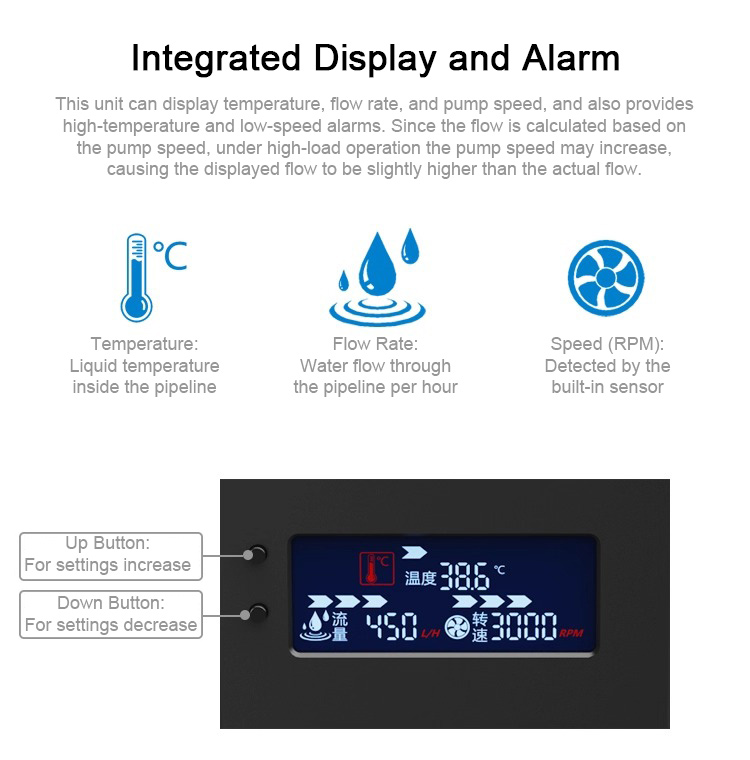 * This unit can display temperature, flow rate, and pump speed, and also provides high-temperature and low-speed alarms. Since the flow is calculated based on the pump speed, under high-load operation the pump speed may increase, causing the displayed flow to be slightly higher than the actual flow.