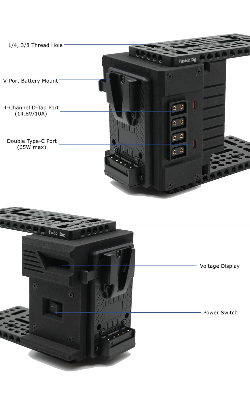 - Combined with a V-port battery, the module can transfer electrical energy to TYPE-C and D-Tap interfaces, and provide power to devices such as cameras, monitors, and heat sinks through fake batteries or data cables. Enable multiple devices to use the same battery simultaneously and significantly increase the power supply duration.